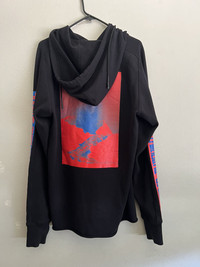 Fall "Utopia/Dystopia" collection combines tactical military features with athletic sportswear in the Arc Hood Sweatshirt. Bold contrasting graphics on front chest, back, and sleeves are printed on soft French Terry knit with knit back and rib cuffs and a thumb opening make this a staple layering piece. 100% Cotton Black French Terry with Multicolored Graphic Drawstring at hood, Tonal Embroidered Logo, Kangaroo Pocket, Embroidered Logo at Front, Raw Edges at Hem, Rib Knit Cuffs with Thumb Opening, Tonal Stitching, Machine Wash Cold Fits True to Size Worn sparingly, like new condition, hit me with questions / offers, trusted seller, fast shipping .