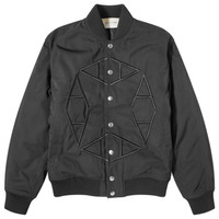 Matthew Williams’s genre-blurring, future-oriented outlook of 1017 ALYX 9SM continues to burn bright. Here the label takes inspiration from collegiate style with this varsity jacket, a technical build guarantees all day durability. For a bold sense of brand identity, an embroidered circular graphic takes pride of place on the chest. - 100% Polyester - Shawl Collar - Snap Button Closure - Side Pockets