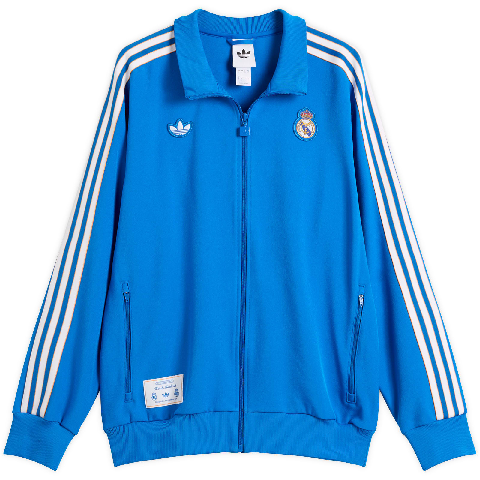 adidas’ Icon series revives classics from the past, reimagining 90s kits of the world’s biggest clubs with 3-Stripes energy. In a bold blue colourway to match the 25/26 season’s third kit, this Real Madrid track top taps into vintage athleisure with an old school logo patch above the hem and a Trefoil logo alongside the club crest on the chest. - 94% Recycled Polyester, 6% Elastane - Stand Collar - Zip Closure - Embroidered Branding - Woven Branded Patch - Ribbed Trims - Style Code: JN3058