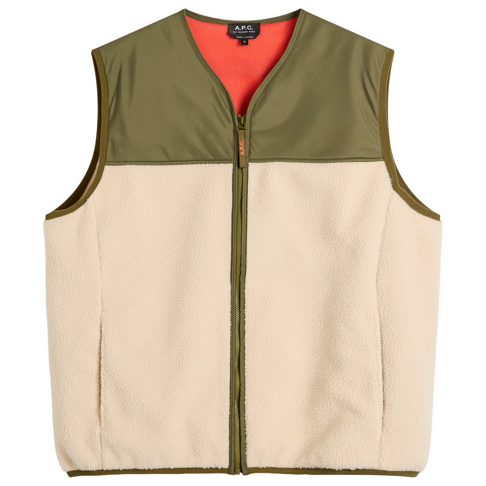 The A.P.C. Marty sherpa fleece gilet elevates casual layering with a striking colour-block design, blending of soft fleece and crisp poplin. Designed for both warmth and breathability, it features a sleek zip closure, handy side pockets and a lightweight mesh lining – it’s the perfect fusion of style and function. - 100% Polyester - Zip Closure - V-Neck - Front Pockets - Branded Zip - Product Code: PSAIF-H32022-AAC