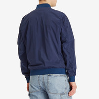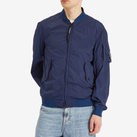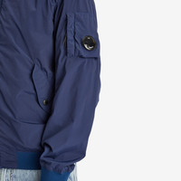 With exhaustive innovation in garment and textile design, this C.P. Company Bomber Jacket is no different. In a bomber style shape, a garment dyed nylon has a hint of stretch for comfort and movement. On the sleeve, a signature pocket is stitched with a Goggle Lens. - 100% Nylon - Shawl Collar - Zip Closure - Side Pockets - Ribbed Trims