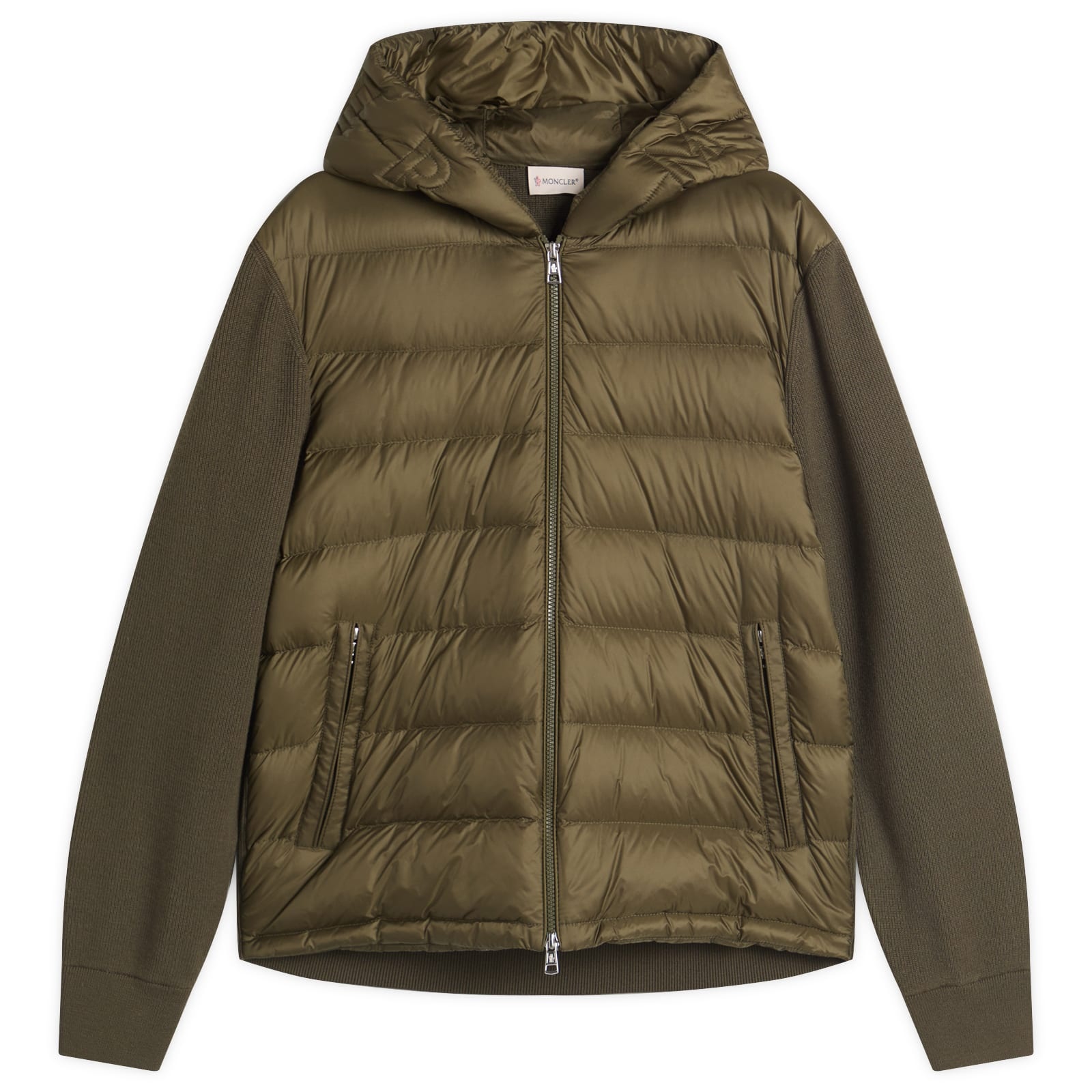 Hybrid by design, this Moncler Hooded Jacket combines a down filled body with finely knitted sleeves. Allowing for ample storage, two slip pockets add a touch of functionality, whilst a felt logo patch adorns the sleeve. - 50% Nylon, 50% Cotton - Fixed Hood - Zip Closure - Side Pockets - Style Code: 9B000-06-M1131-825