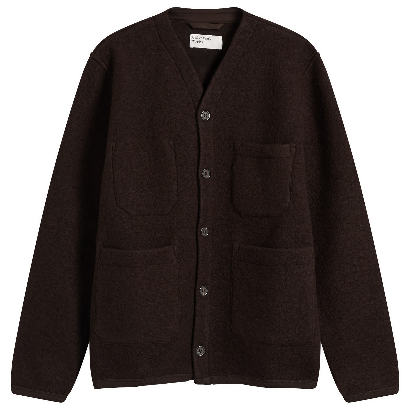 A long-standing favourite from Universal Workss, this wool fleece cardigan works hard and looks good - year after year. Knitted in a wool-blend, it stands by the British brand’s “never overdesigned” ethos, with a subtle and soft structure and tonal jersey at the placket, cuffs and hem. - 65% Wool, 35% Polyester - V-Neck - Chest Pocket - Button Closure - 2 Patch Pockets - Jersey Trims - Style Code: 00016-BRN