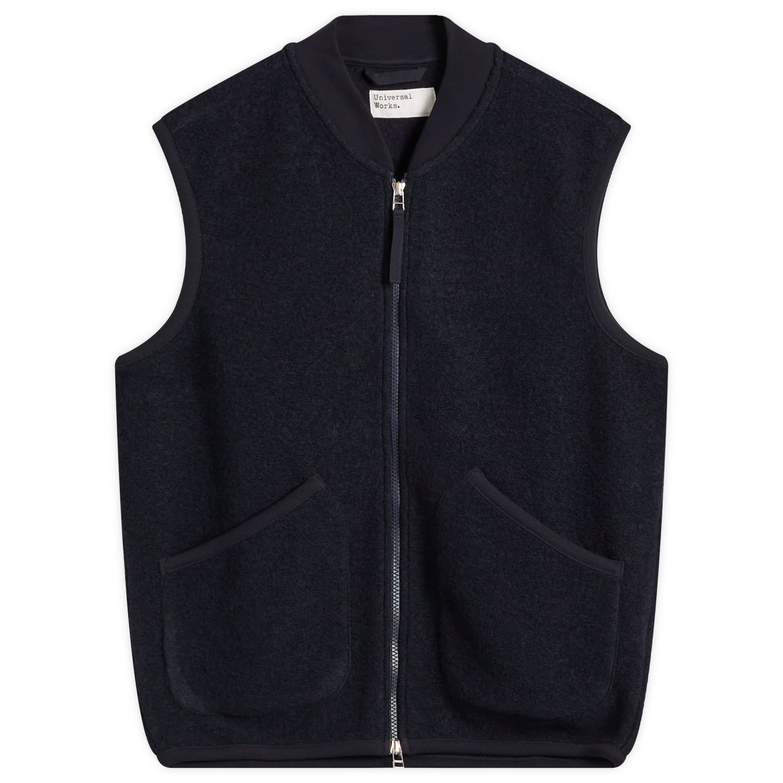 Universal Works’ no-nonsense, practical approach to fashion celebrates the balance between utility and style, offering pieces that are versatile, durable, and easy to wear. The wool fleece zip waistcoat makes layering a breeze whilst offering a premium feel to the touch – thanks to its luxurious merino wool blend. Kept plain and simple, it’s finished with two slanted patch pockets above the hem. - 65% Wool, 35% Recycled Polyester - Front Zip Closure - 2 Patch Pockets - Cotton Ribbed Trims - Style Code: 00015-NVY