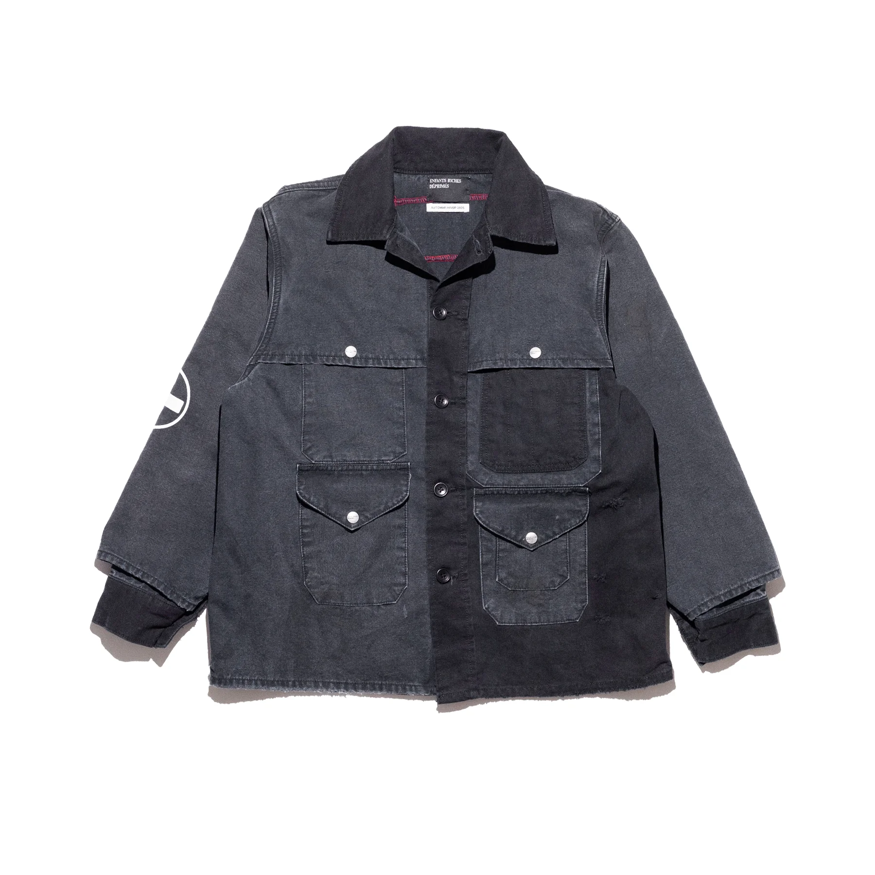 DOUBLE SLEEVE WORK SHIRT IN JAPANESE CANVAS. TONAL PANNELLED CONSTRUCTION. DYED COROZO BUTTON FRONT. SNAP CLOSURE POCKETS AT CHEST & WAIST. GAME POCKET WITH SNAP CLOSURE AT REAR PANEL. PRINTED ARTWORK PATCH AT REAR. PRINTED ARTWORK AT SLEEVE. MADE IN THE USA.