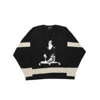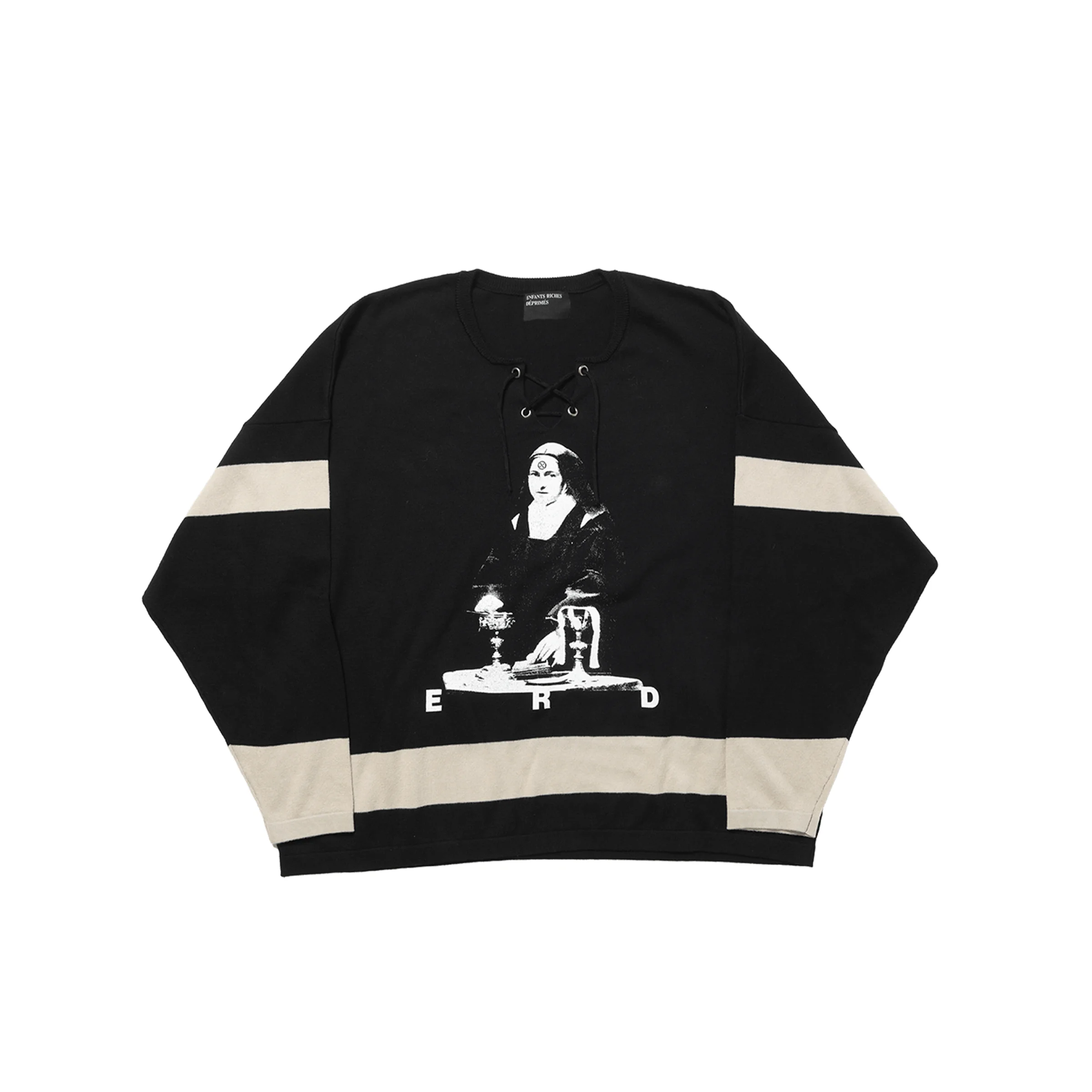 HOCKEY JERSEY IN CUSTOM COTTON KNIT. LACE-UP DETAIL AT NECK. STRIPE AT BICEP, WRISTS, & BODY HEM. PRINTED ARTWORK AT FRONT & BACK. MADE IN ITALY. SHIPS IN 1-2 WEEKS.