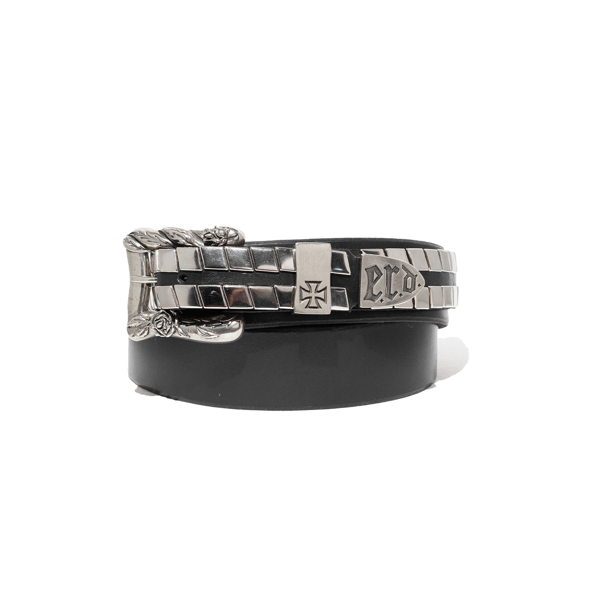 BELT IN HEAVY COWHIDE LEATHER. CUSTOM CAST WHITE BRONZE BUCKLE, LOOP, AND TIPS. DECORATIVE EXTRA BELT TIPS. HAND-STUDDING THROUGHOUT. MADE IN THE USA.