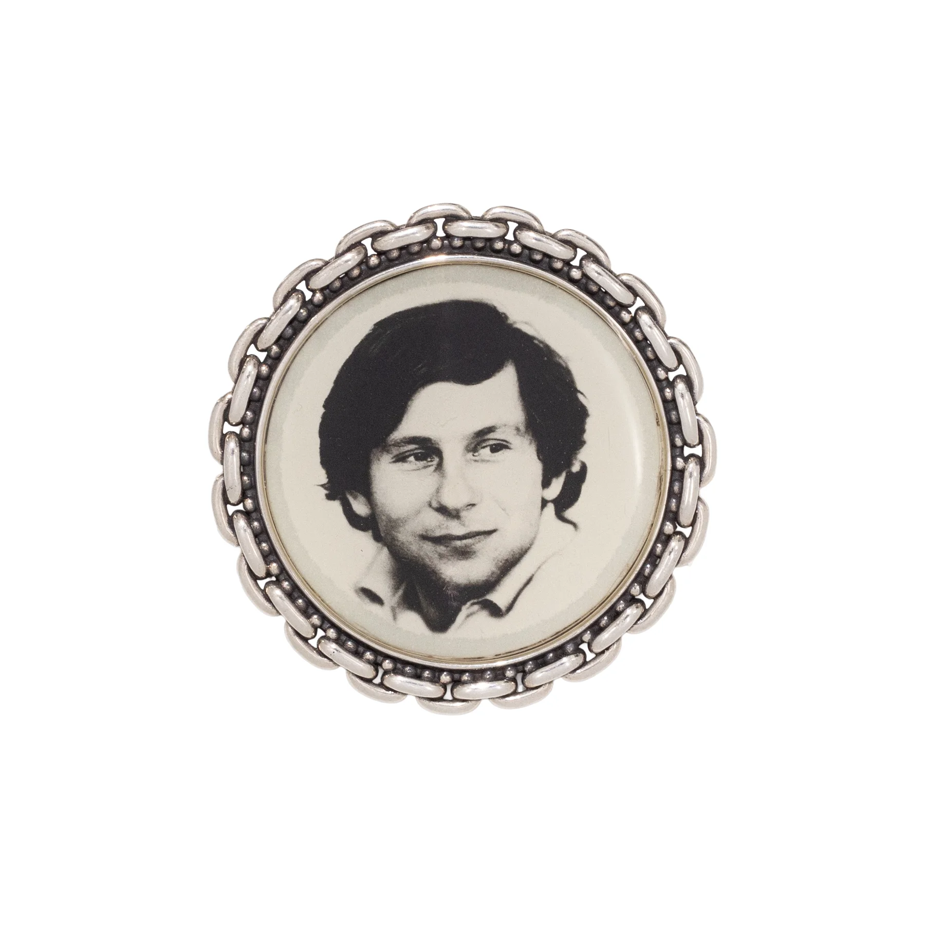 .925 STERLING SILVER PUSH PIN BROOCH WITH ROMAN POLANSKI PORTRAIT. MADE IN THE USA.