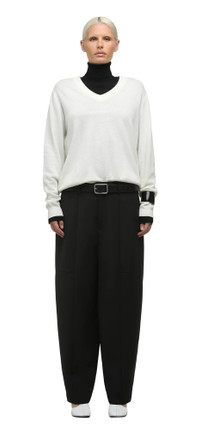 - 40% WOOL, 3% LYCRA, 57% POLYESTER - PINTUCK DETAILING - SLANT POCKETS - CARROT SHAPE - UNISEX FIT - YKK METAL FLY ZIPPER