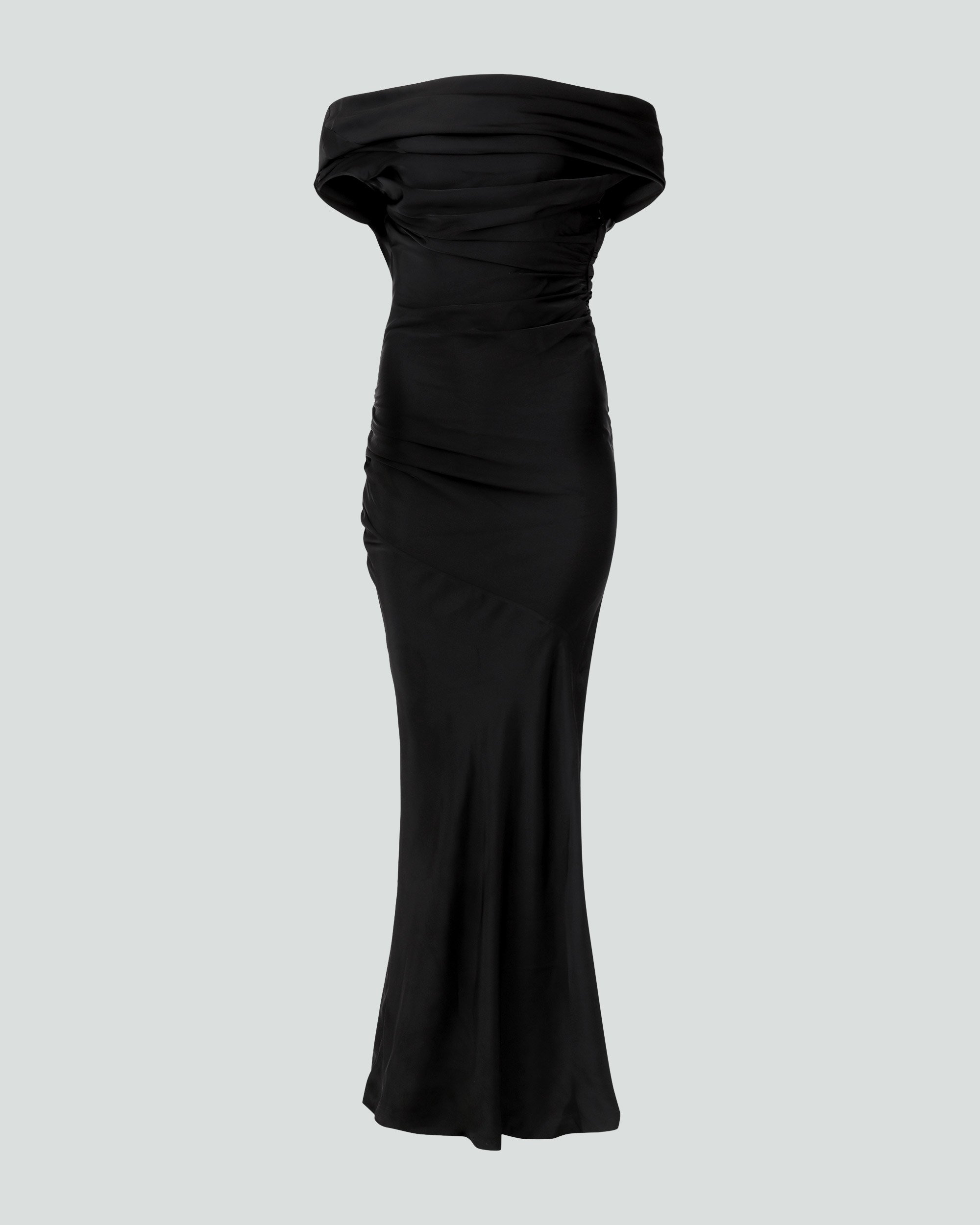 - 100% TENCEL - SIDE YKK INVISIBLE ZIPPER - DRAPED NECK LINE - PLEATS AND GATHERED DETAILING - FLOOR LENGTH - BIAS CUT