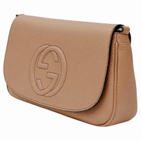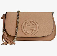 GUCCI 536224 198879 100% Authentic. Exterior Material: Textured Calf Leather. Interior Material: Tan Canvas. Color: Camelia Beige. Light Gucci Gold Tone Hardware. Gucci GG Embossed Logo. Detachable Tassel Accent. Gold Chain Strap. Strap Drop: 21.5" inches. Front Flap Magnetic Snap Closure. Interior: One Zip pocket, and One Slip pocket. Measurements: L11"x H6.75"x D 3.5" Condition: New with Tags. Includes care cards and dust bag. Made in Italy.