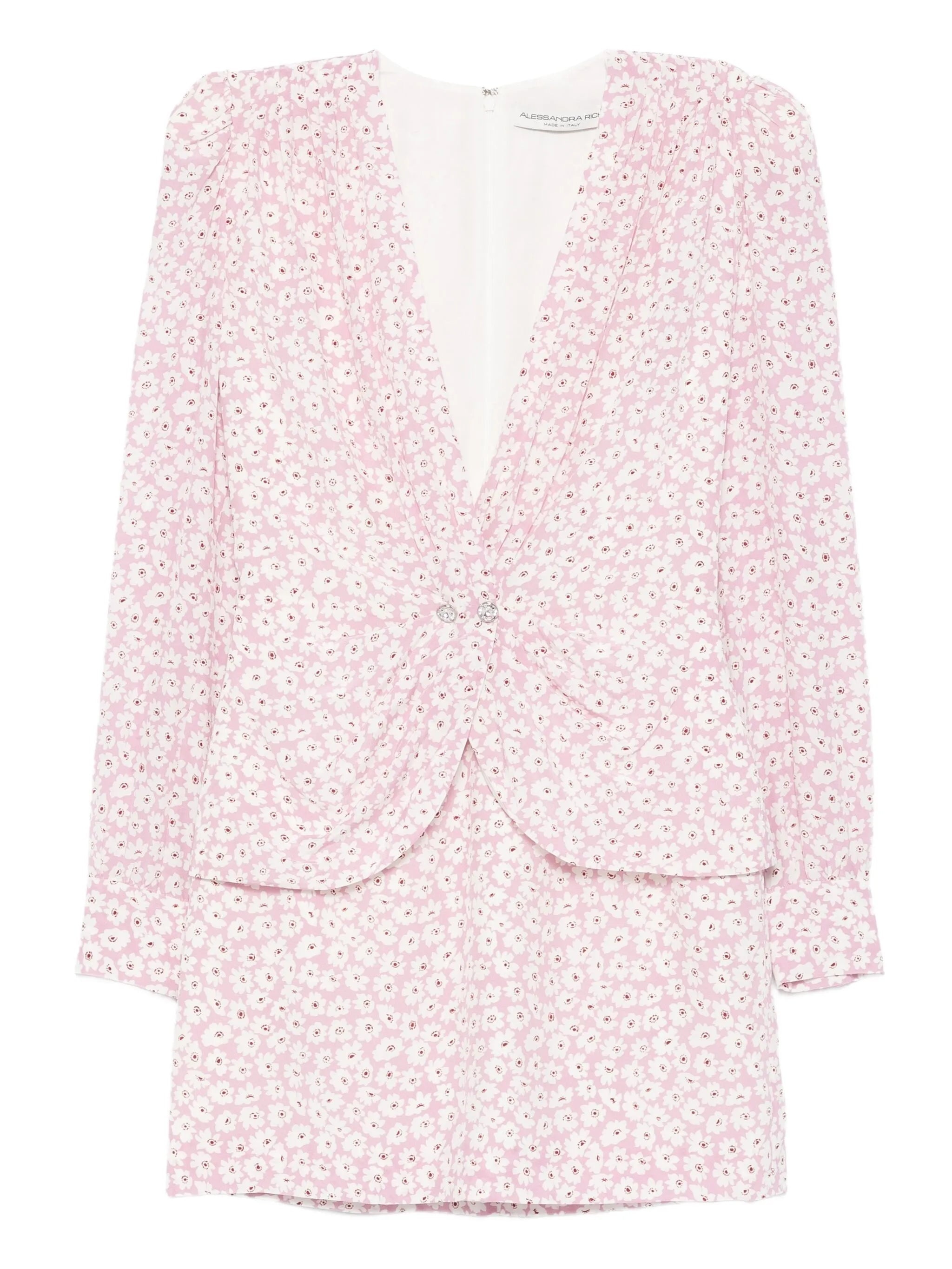 Wrap-effect embellished pleated floral-print silk crepe de chine mini dress Pink