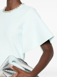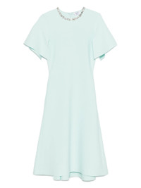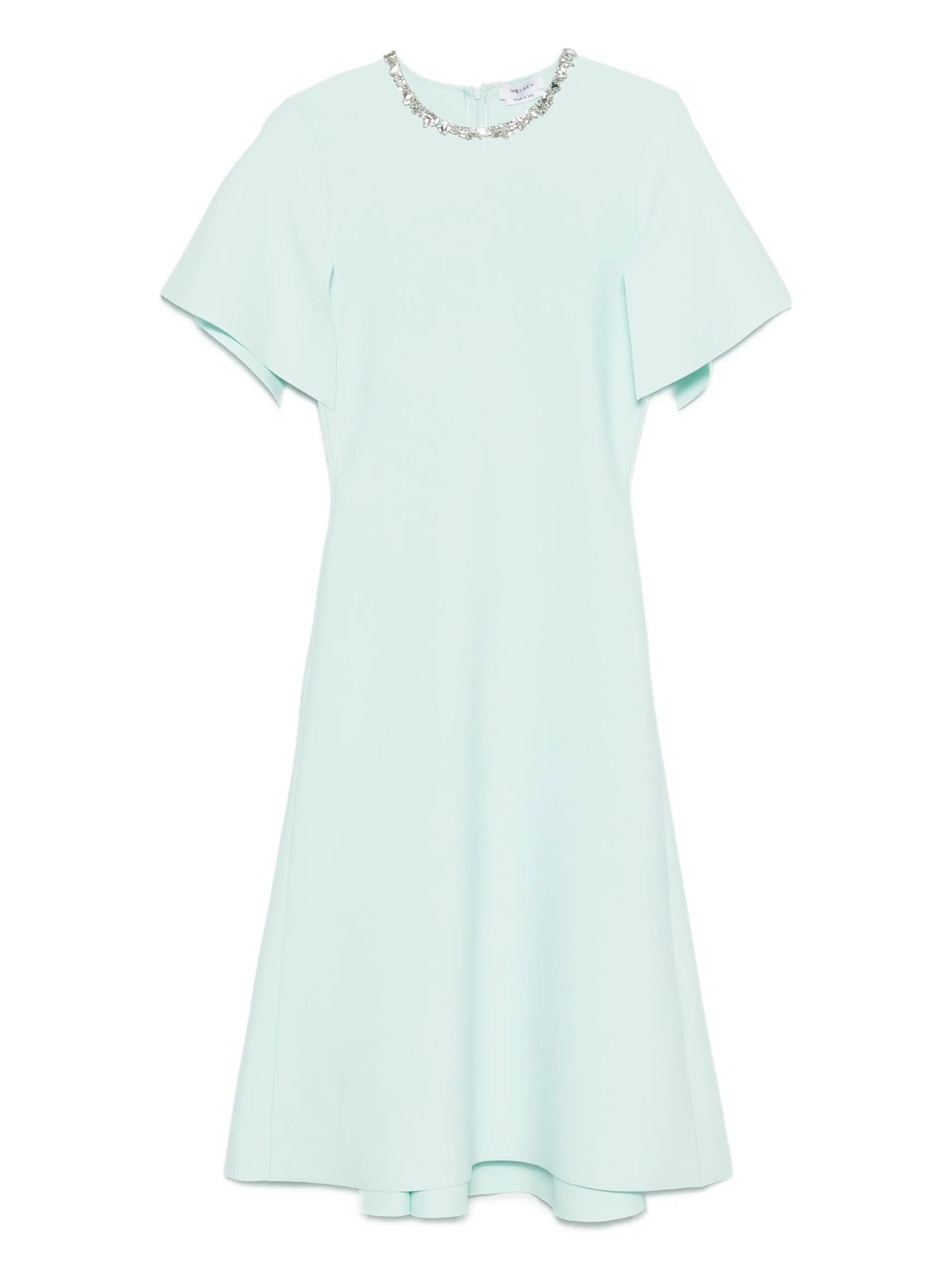 green crystal embellishment neckline short sleeves A-line shape flared skirt - Color: BLUE - Made in: Italy - Designer Style ID: 839820 Q1BEN 4333 Composition and care Polyamide: 4.0%, Polyester: 16.0%, Spandex/elastane: 2.0%, Viscose: 78.0%, Metal: 100.0%, Glass: 100.0%