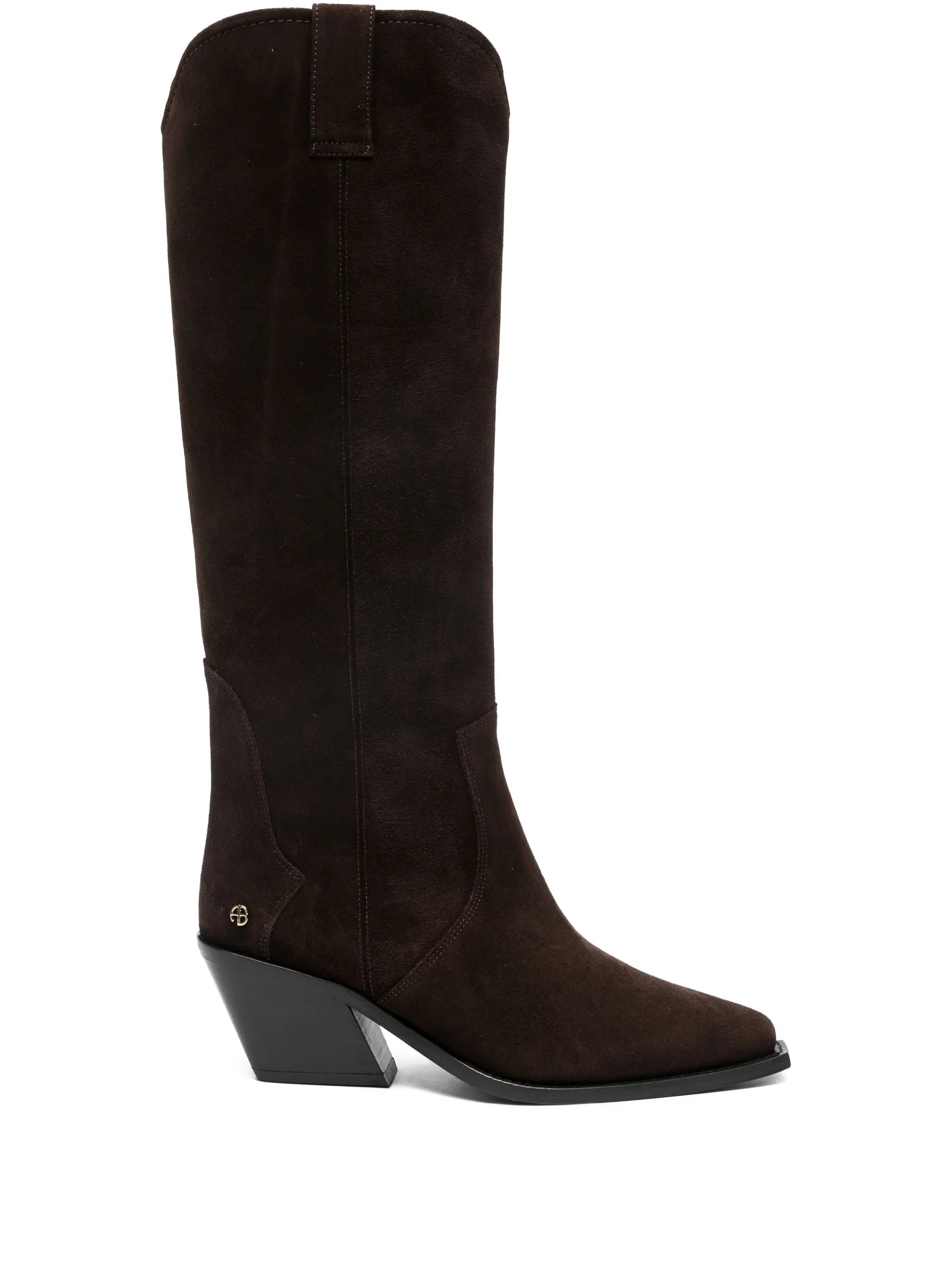 dark brown suede upper pointed toe knee-high shaft block heel gold-tone detail - Color: BROWN - Made in: Turkey - Designer Style ID: A-14-4142 DBN1 Composition and care Lining Composition Calf Leather: 100.0%, Sole Composition Calf Leather: 100.0%, Outer Composition Suede: 100.0%