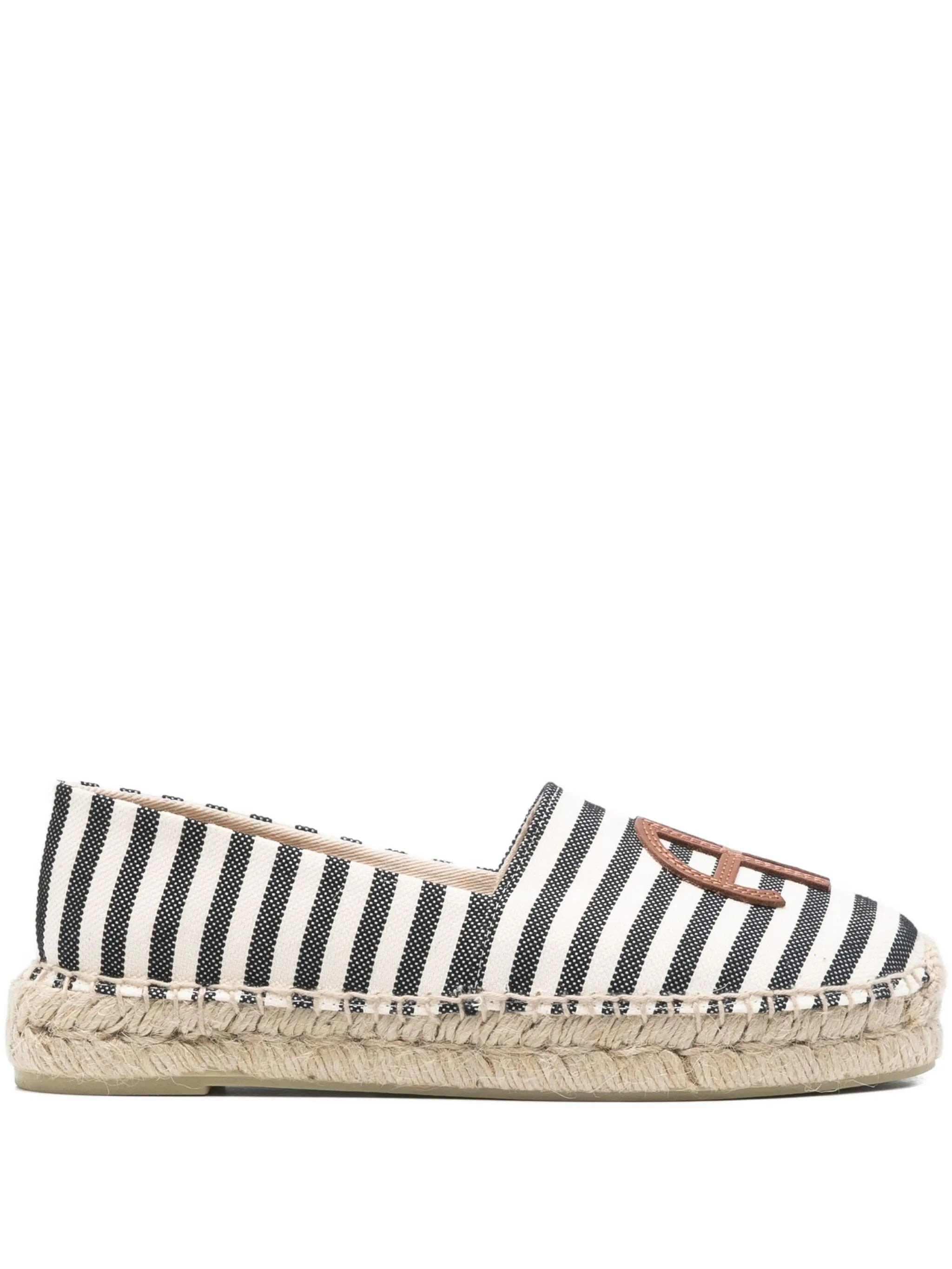 black and beige striped pattern logo detail jute sole slip-on style flat heel - Color: BLACK/NEUTRALS - Made in: Bangladesh - Designer Style ID: A-14-11222 MTL1 Composition and care Sole Composition Rubber: 100.0%, Outer Composition Fabric: 100.0%, Lining Composition Fabric: 100.0%
