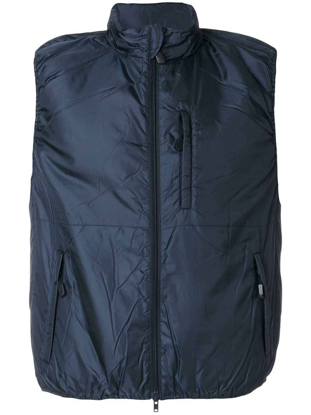 navy blue padded design branded zip puller high neck front two-way zip fastening sleeveless zip-fastening chest pocket two side zip pockets elasticated hem straight hem - Color: BLUE - Made in: Romania - Designer Style ID: G199 7961 96101 Composition and care Outer Composition Polyamide: 100.0%, Lining Composition Polyamide: 100.0%, Lining Composition Polyester: 100.0%