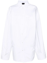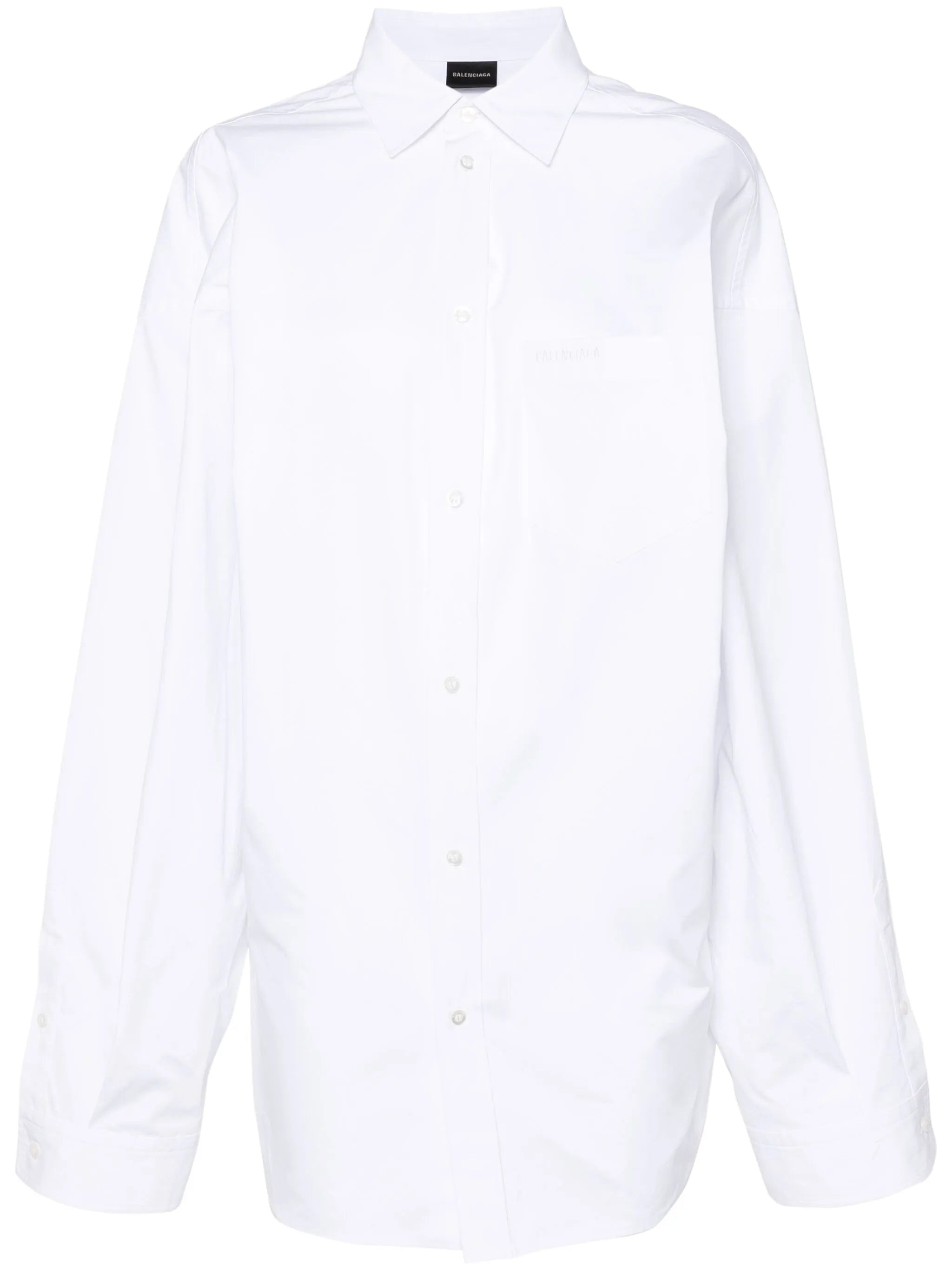 white poplin texture asymmetric design spread collar drop shoulder extra-long sleeves embroidered logo at the chest chest patch pocket curved hem front button fastening - Color: WHITE - Made in: Madagascar - Designer Style ID: 790945 TQM05 9000 Composition and care Polyester: 100.0%