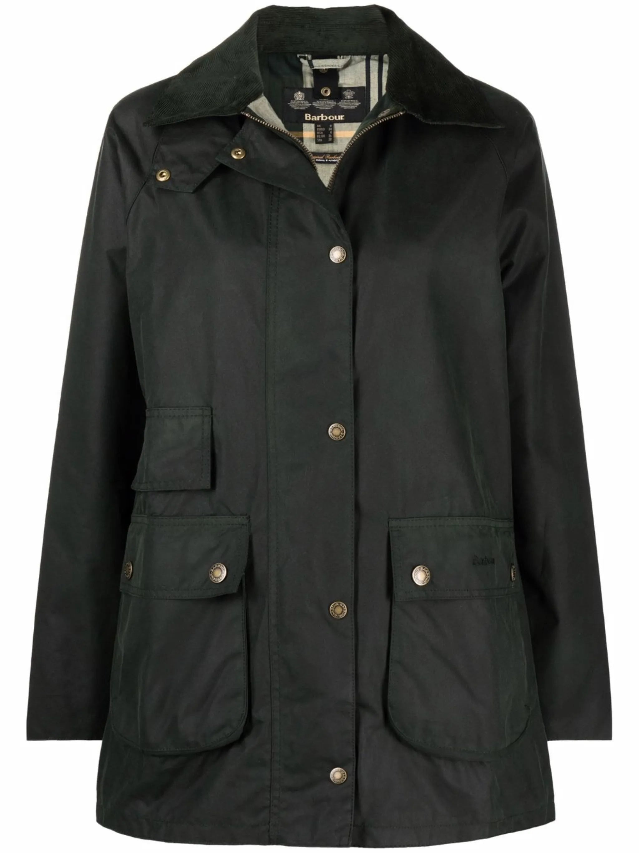 dark sage green cotton wax coated corduroy collar front press-stud fastening front zip fastening long sleeves two side flap pockets - Color: GREEN - Made in: United Kingdom - Designer Style ID: LWX1193 SG51 Composition and care Outer Composition Cotton: 100.0%, Lining Composition Cotton: 35.0%, Lining Composition Polyester: 65.0%