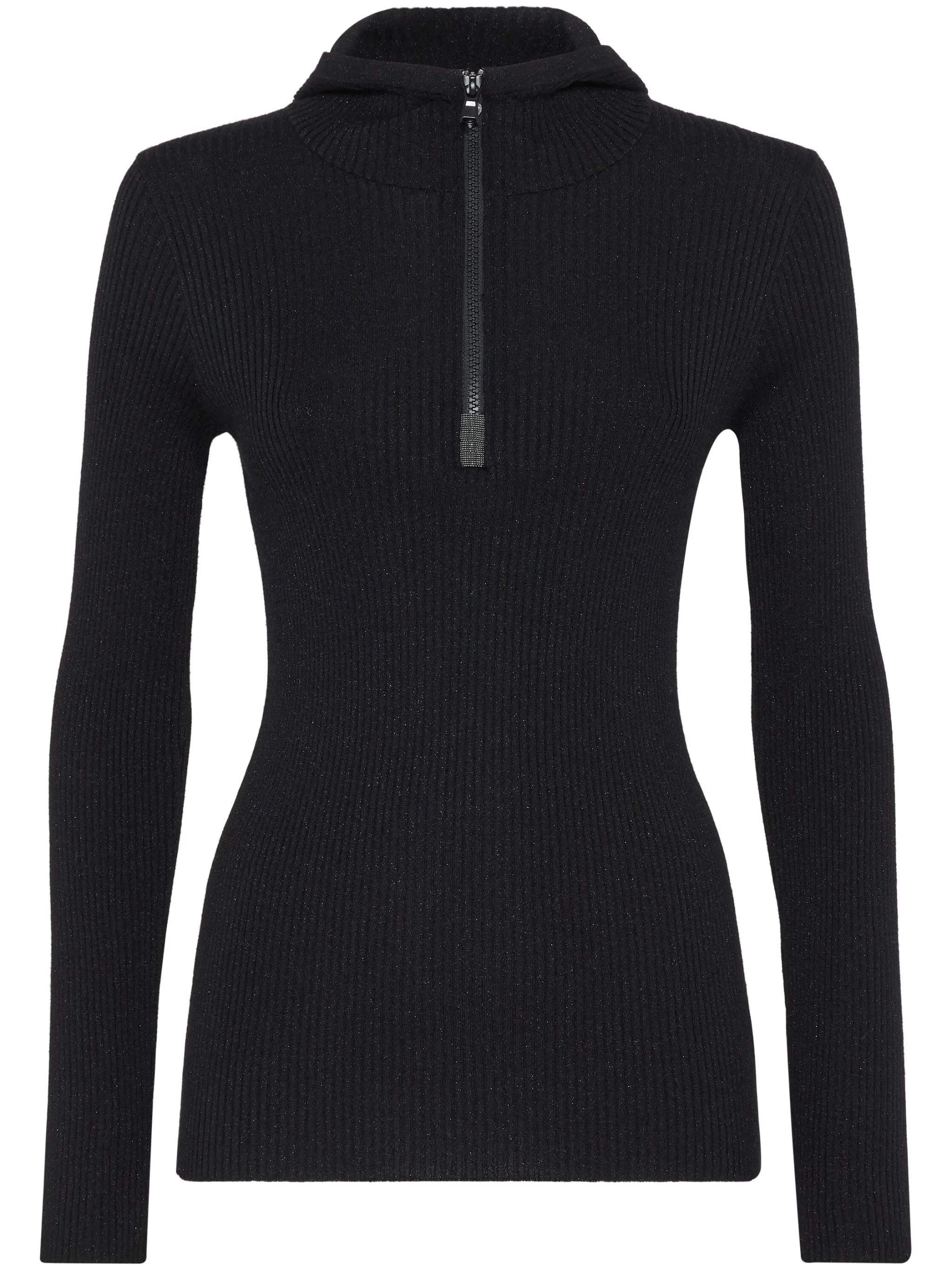 black cashmere blend ribbed knit lightweight classic hood short front zip fastening signature Monili chain detail long sleeves straight hem - Color: BLACK - Made in: Italy - Designer Style ID: M41844609 C101 Composition and care Silk: 22.0%, Polyamide: 20.0%, Cashmere: 51.0%, Metallized Polyester : 7.0%