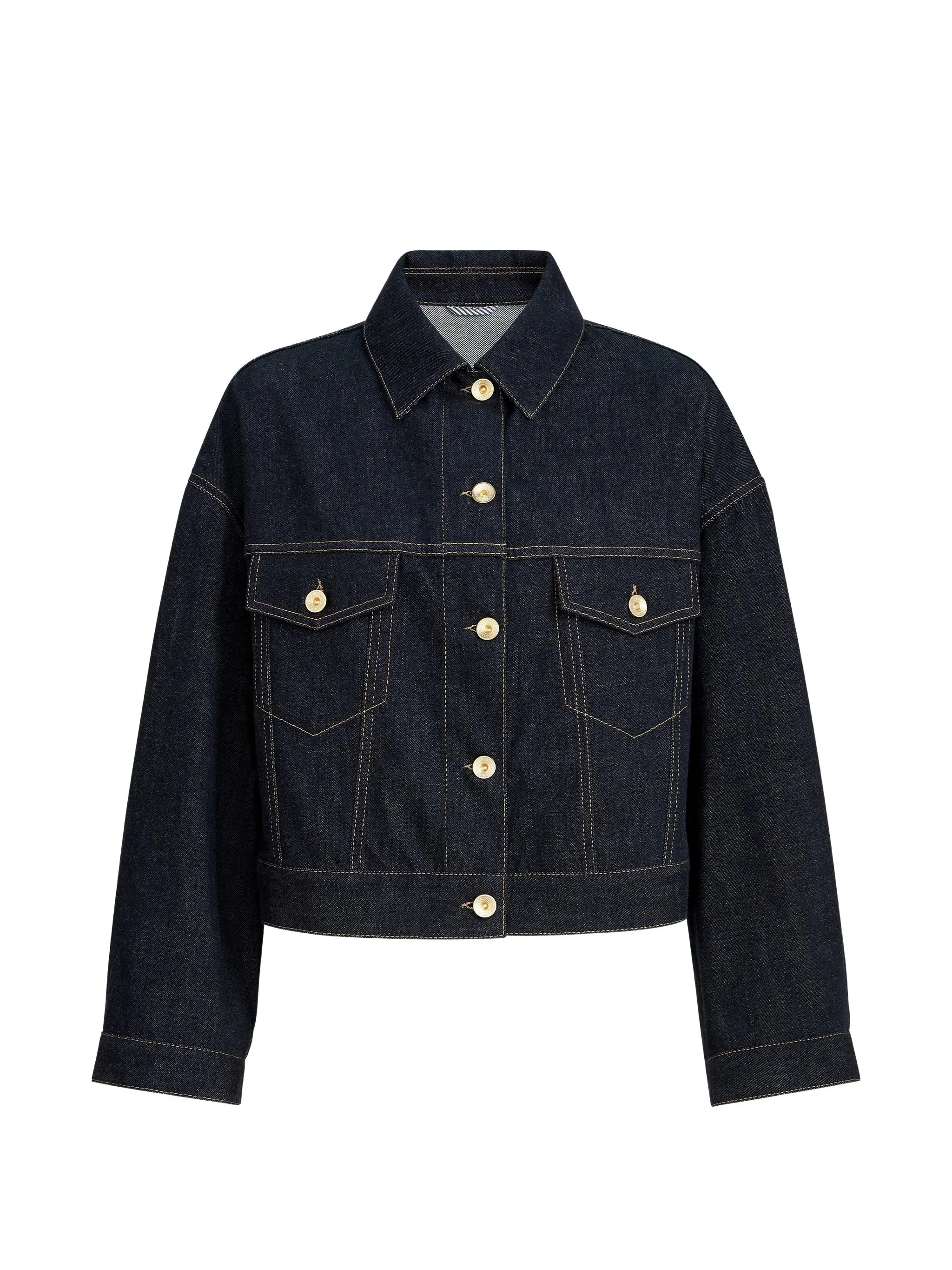 No-fade denim outerwear jacket with monili
