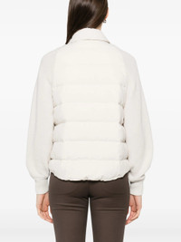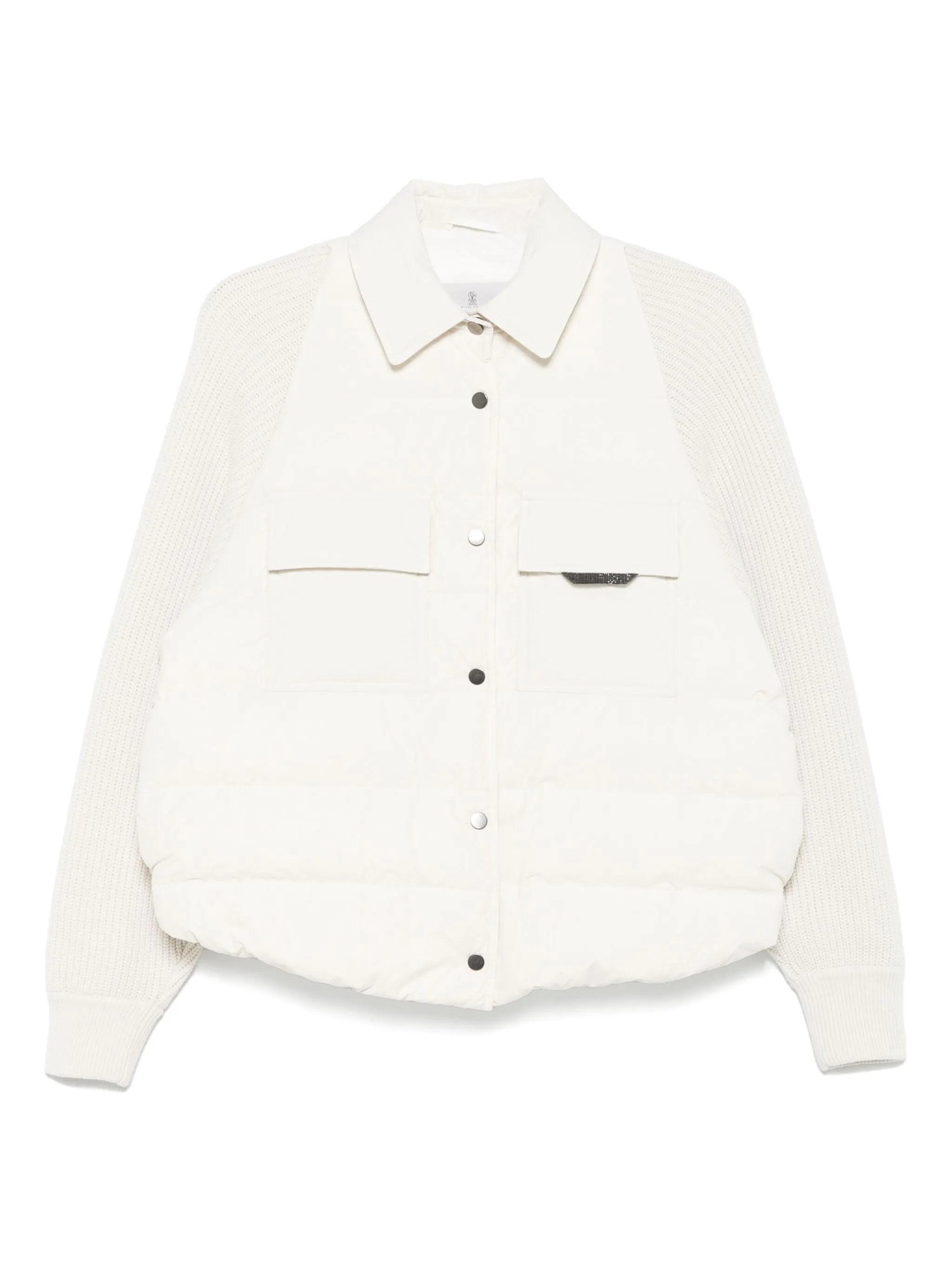 Water-resistant techno cotton and virgin wool, cashmere and silk knit down jacket with shiny flap de