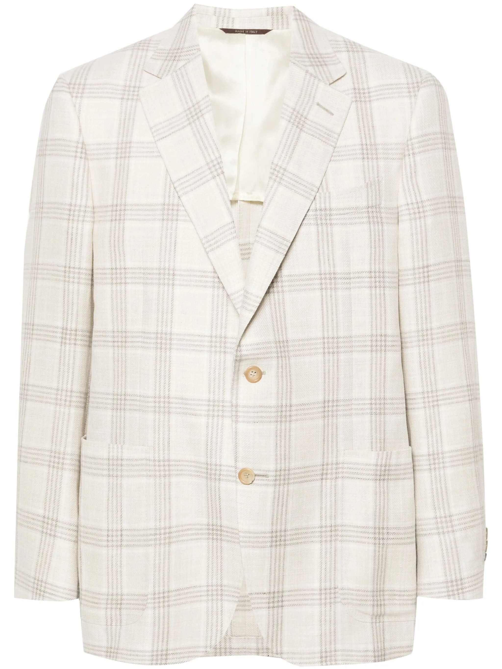 ivory white/grey linen-wool blend plaid check pattern twill weave notched lapels long sleeves with buttoned cuffs chest welt pocket two side patch pockets English rear vents multiple internal slip pockets internal logo patch curved hem front button fastening - Color: NEUTRALS - Made in: Italy - Designer Style ID: CF02005 21288 706 Composition and care Outer Composition Linen/flax: 60.0%, Lining Composition Cupro: 100.0%, Outer Composition Wool: 40.0%