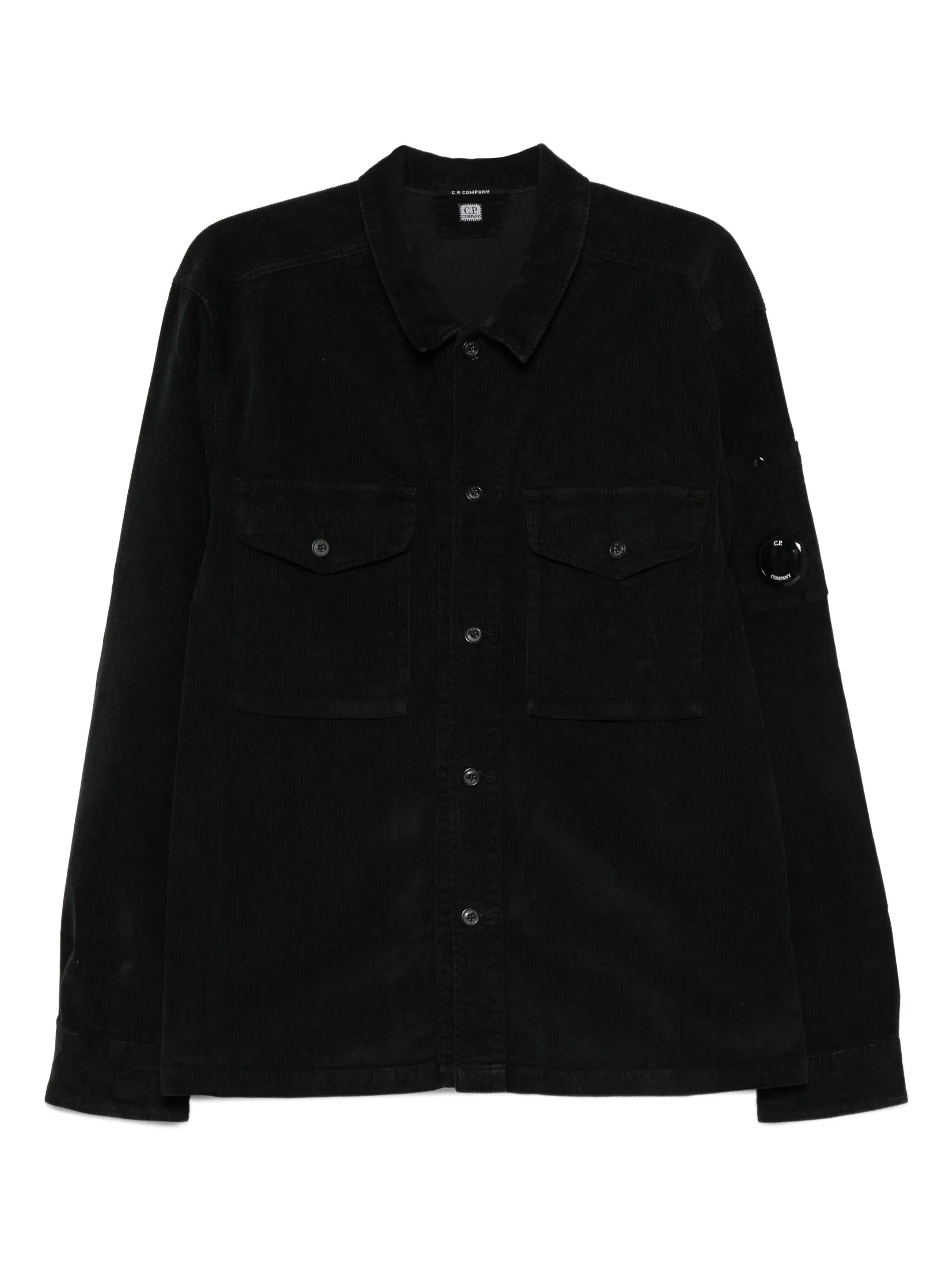 black corduroy texture button fastening chest pockets long sleeves Lens detail C.P. Company suggests removing any detachable accessories before washing. - Color: BLACK - Made in: Tunisia - Designer Style ID: MOS072A00 6410O 999 Composition and care Cotton: 97.0%, Elastane: 3.0%