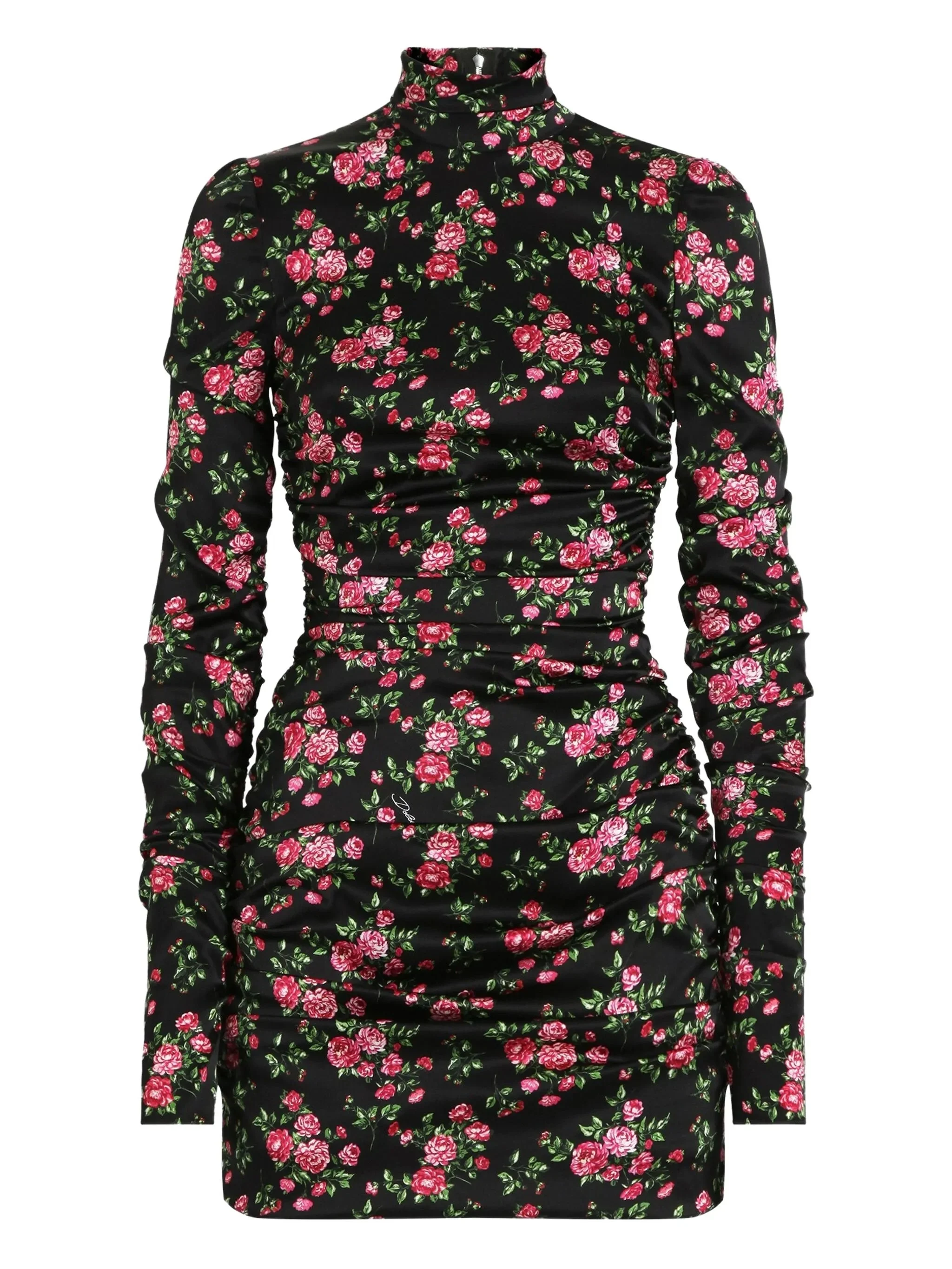 black floral print long sleeves high neck ruched detail - Color: BLACK/PINK - Made in: Italy - Designer Style ID: F60G2T FSA8G HN5XP Composition and care Outer Composition Silk: 93.0%, Lining Composition Silk: 91.0%, Outer Composition Elastane: 7.0%, Lining Composition Elastane: 9.0%