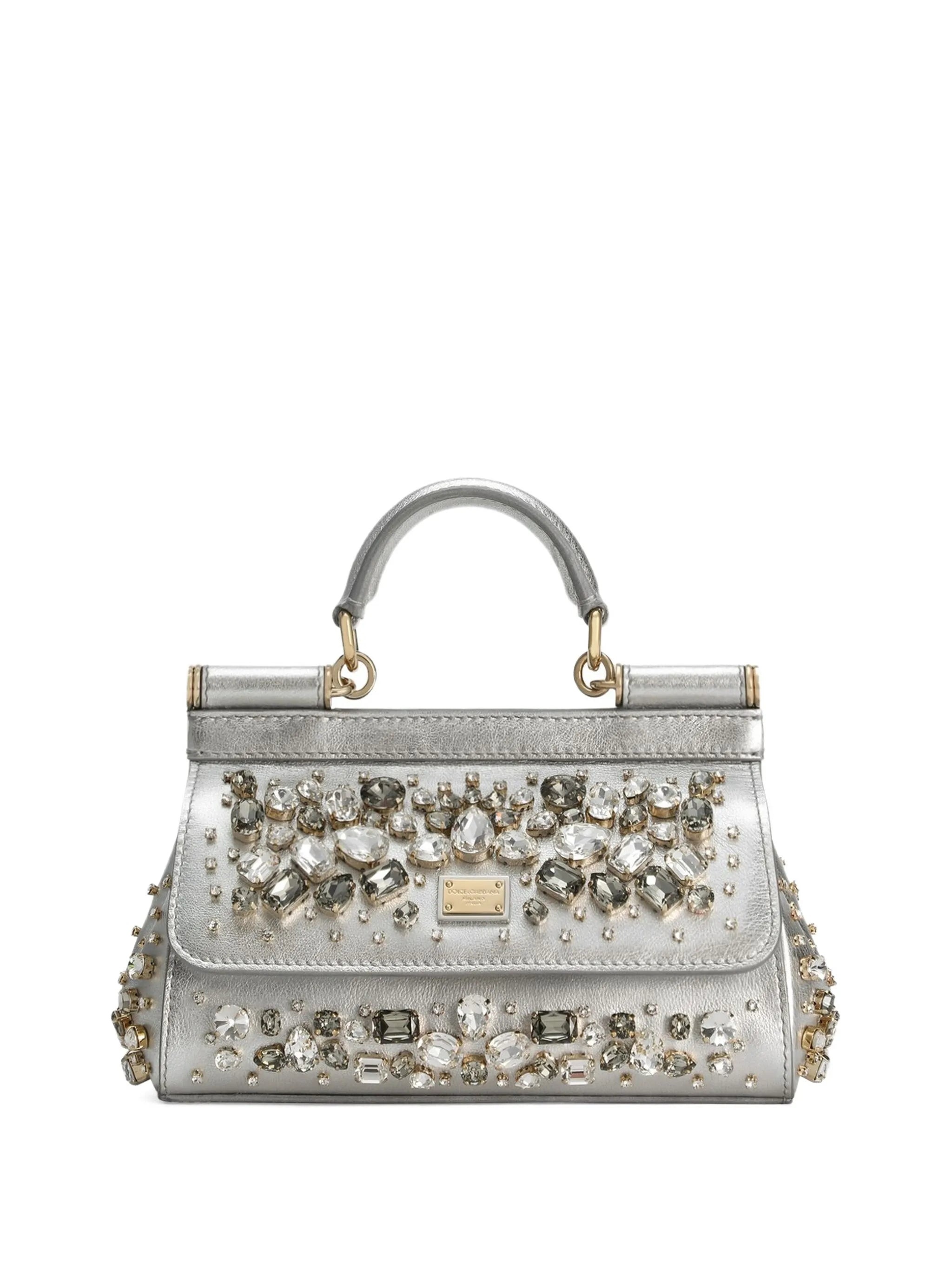 silver crystal embellishments structured silhouette detachable shoulder strap magnetic clasp closure - depth: 6.0 centimetres, height: 13.0 centimetres, width: 19.0 centimetres - Color: SILVER - Made in: Italy - Designer Style ID: BB7116 BH743 8D708 Composition and care Outer Composition Calfskin: 100.0%, Lining Composition Calfskin: 5.0%, Lining Composition Silk: 30.0%, Lining Composition Viscose: 65.0%, Outer Composition Glass: 100.0%