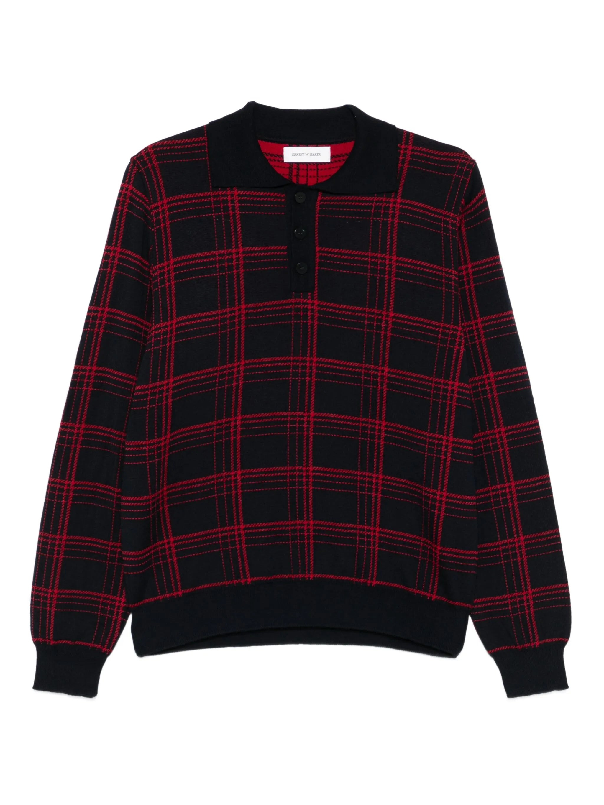 navy blue and red checked pattern polo neck long sleeves button fastening ribbed cuffs - Color: BLUE/RED - Made in: Portugal - Designer Style ID: KN167 EM49 NVRD Composition and care Acetate: 50.0%, Merino: 50.0%