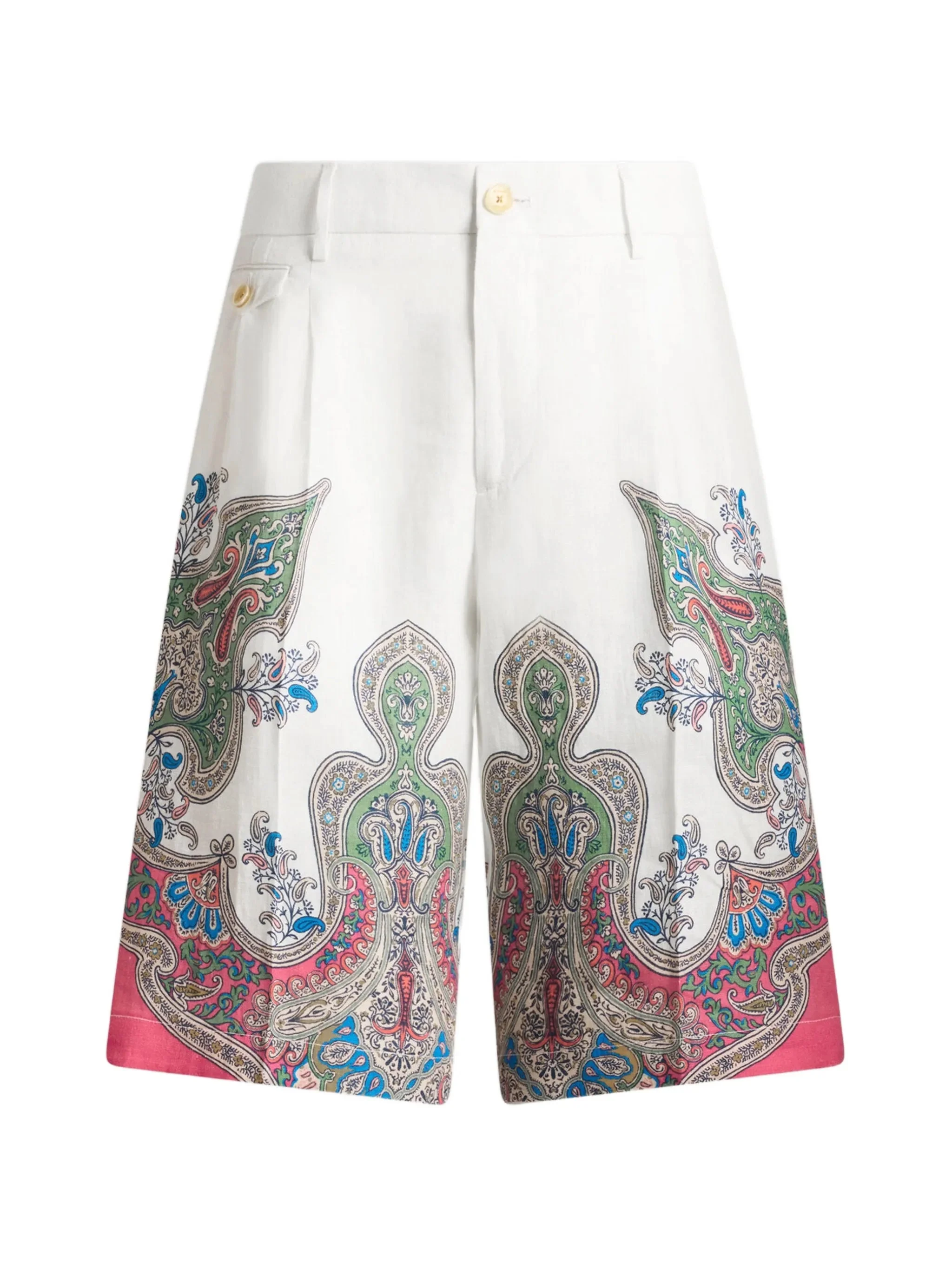 LINEN SHORTS WITH PLACED FLORAL PAISLEY PRINT