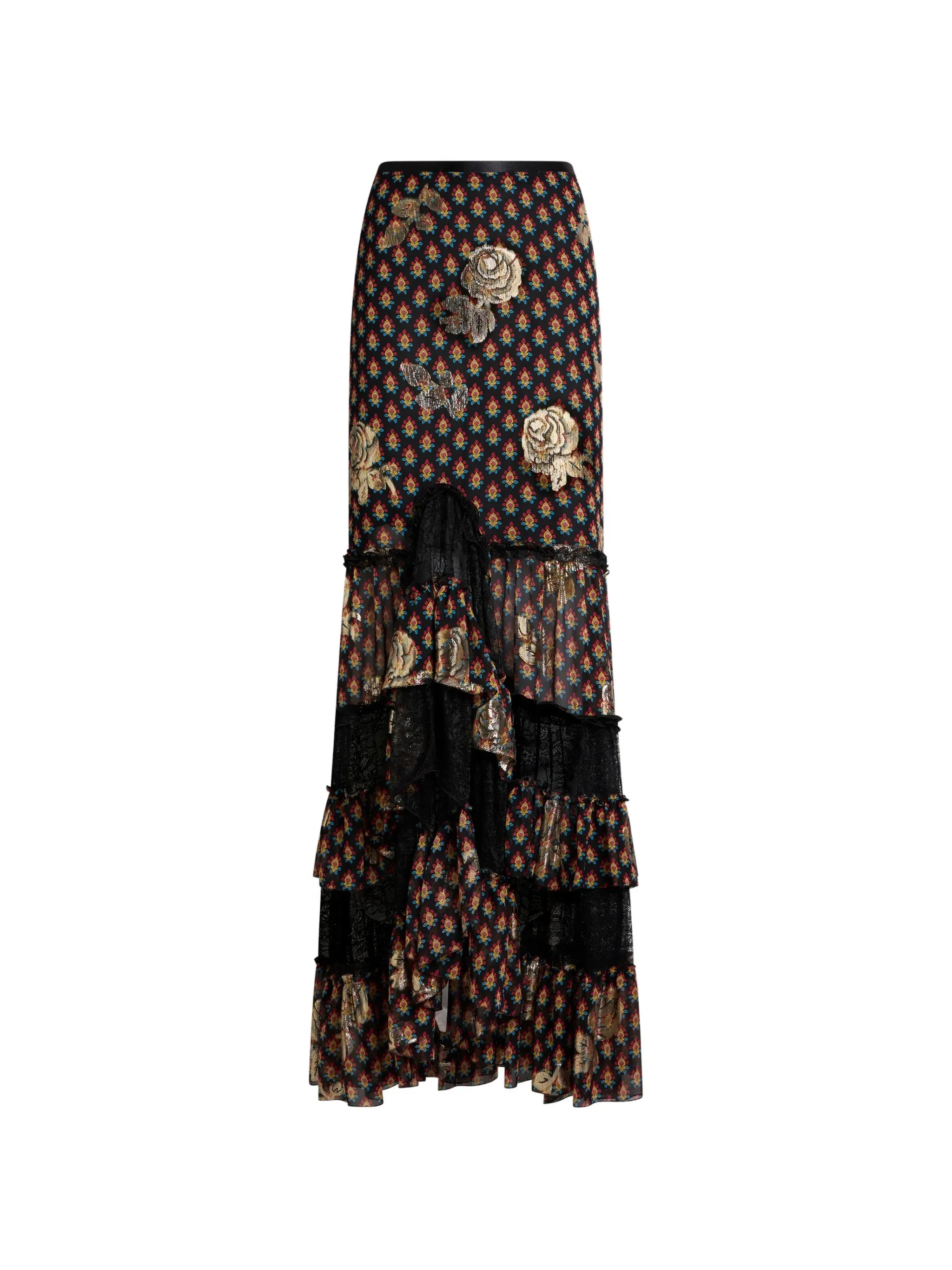 SILK AND LACE MAXI SKIRT WITH FIL COUPÉ ROSES AND TIE-INSPIRED MOTIF