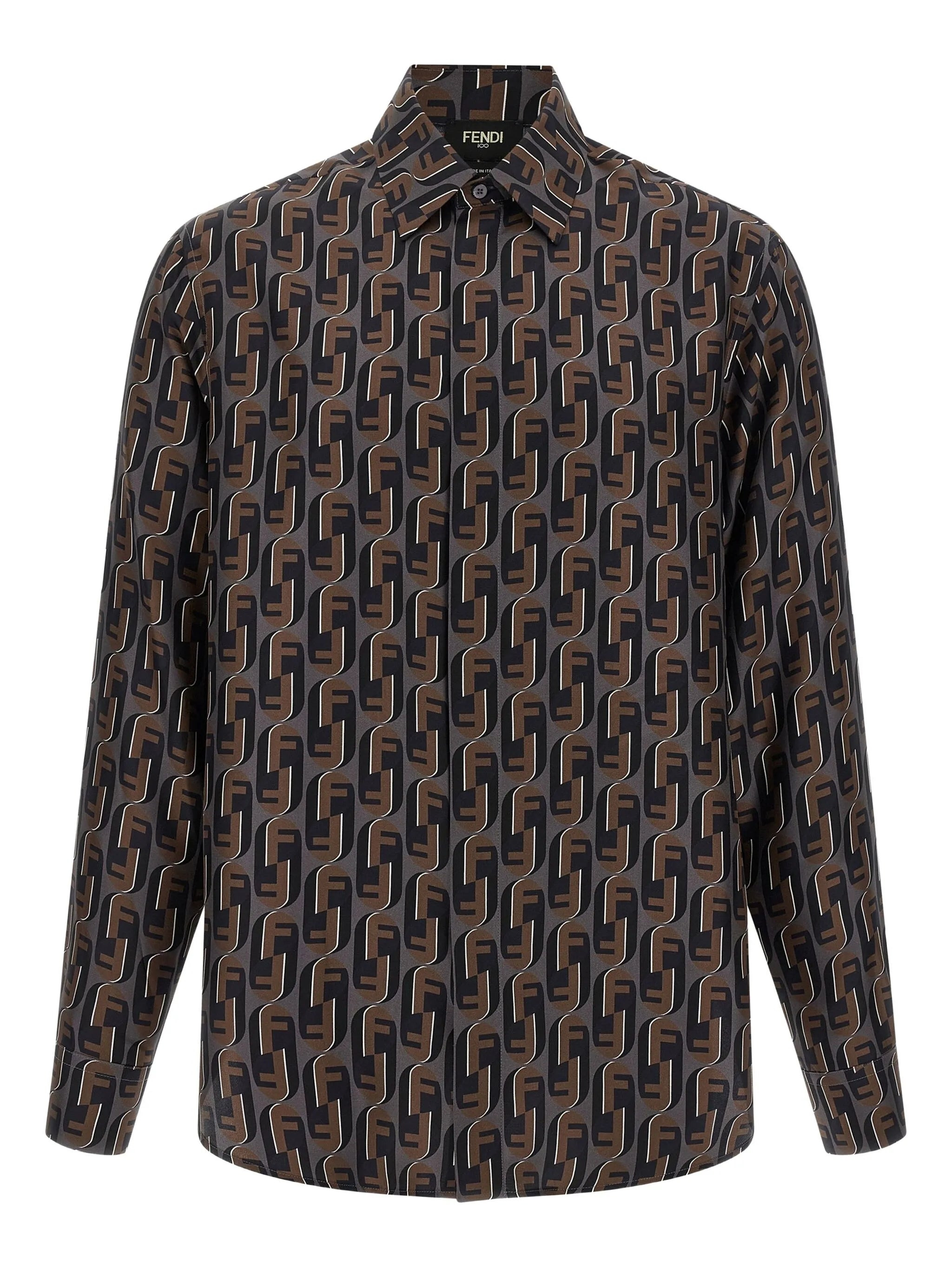 dark grey Fendinity print concealed button closure long sleeves cuffed sleeves silk fabric - Color: BROWN - Made in: Italy - Designer Style ID: AVDB FS1319 F1TRS
