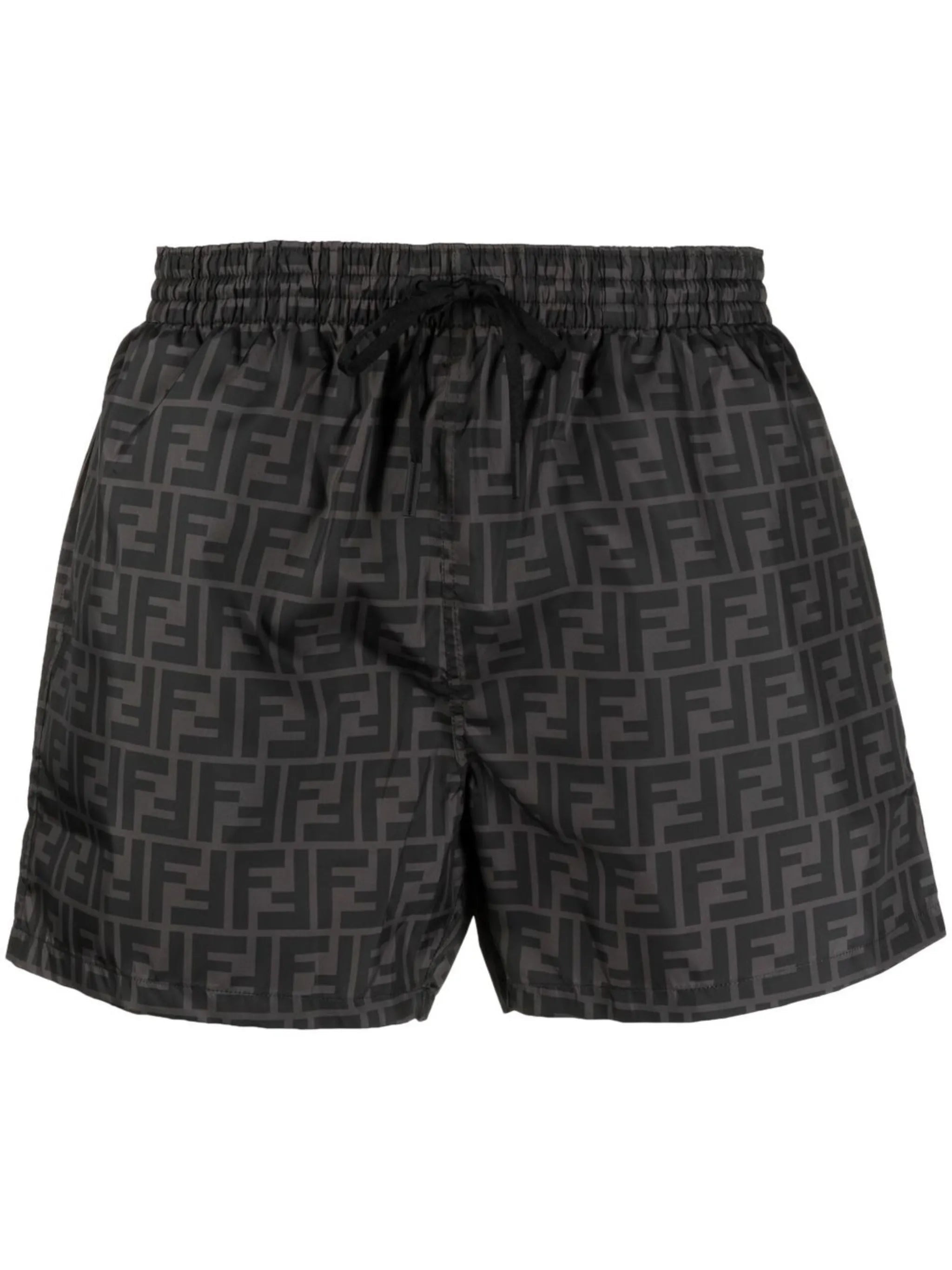 FF-logo print swim shorts from FENDI featuring black, dark grey, drawstring fastening waist, FF-logo print and straight leg. Be mindful to try on swimwear over your own garments.. - Color: BLACK/GREY - Made in: Italy - Designer Style ID: A79F FXB077 F0P9B Composition and care Lining Composition Polyamide: 82.0%, Outer Composition Polyester: 100.0%, Lining Composition Spandex/elastane: 18.0%