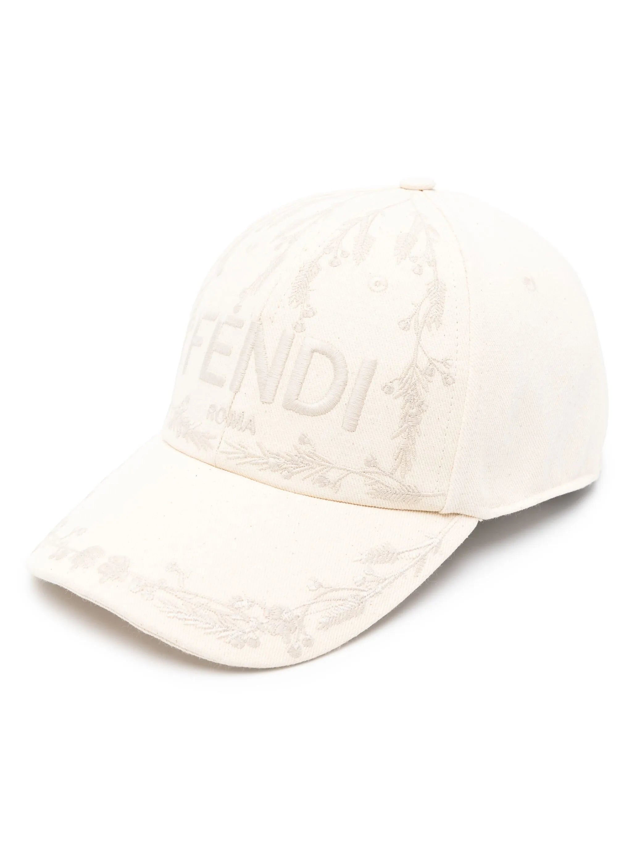 ecru cotton twill weave embroidered logo to the front floral embroidery six-panel construction eyelet vents fabric-covered button at the crown curved peak adjustable strap to the rear unlined - brim: 7.5 centimetres, circumference: 59.0 centimetres - Color: NEUTRALS - Made in: Italy - Designer Style ID: ARGL FXQ969 F1O6A Composition and care Outer Composition Cotton: 100.0%, Lining Composition Cotton: 100.0%