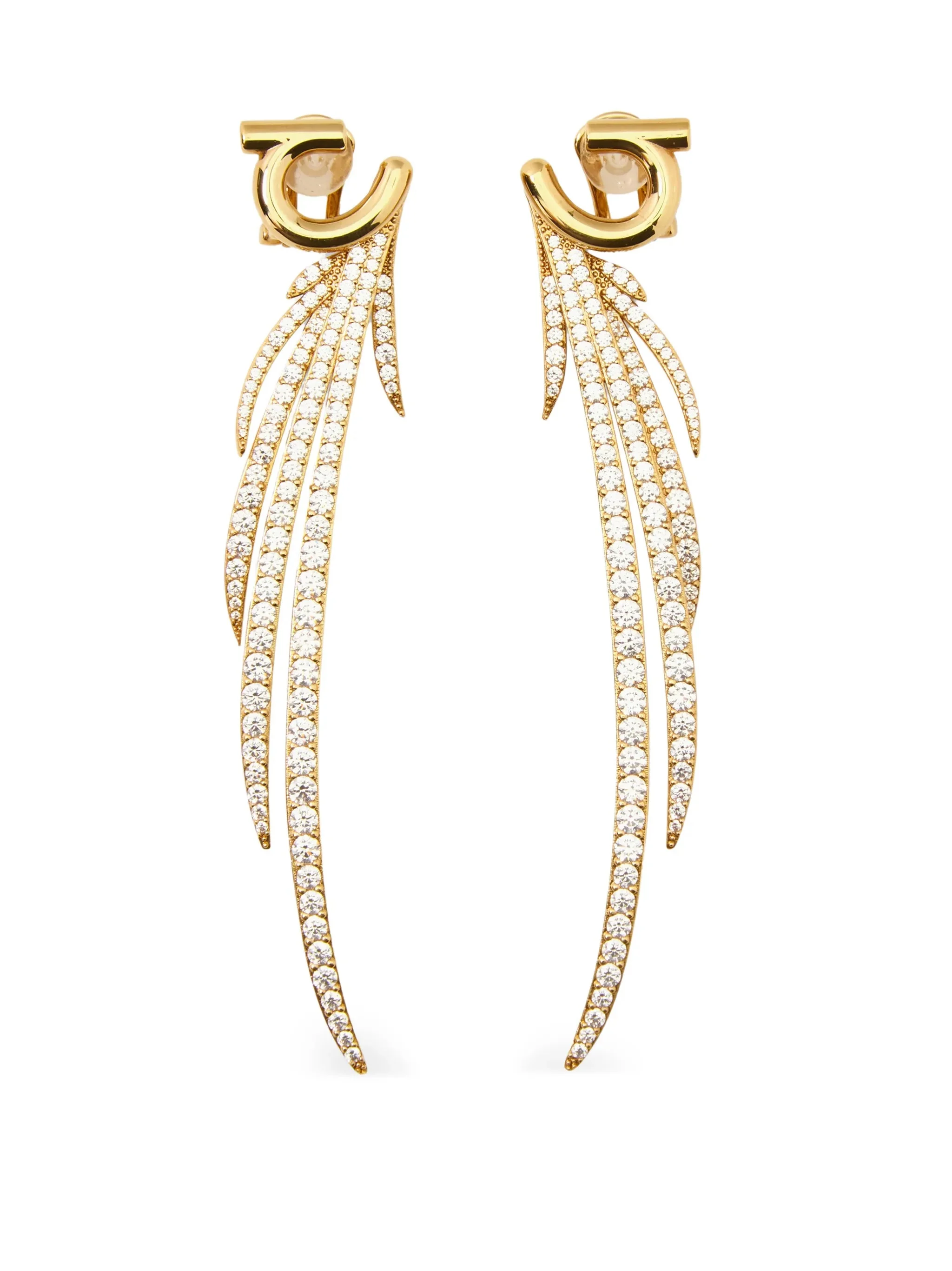 Like glistening feathers suspended in motion, the crystal pave pendants of these earrings evoke the opulent motifs of heritage scarves. A Gancini-inspired detail graces the lobe, adding a whisper of identity and timeless charm. gold-tone polished finish These earrings come as a pair. Normal everyday use and external ag - Color: GOLD/WHITE - Made in: Italy - Designer Style ID: 760967 0794089 ORCRY Composition and care Crystal: 100.0%, Brass: 100.0%