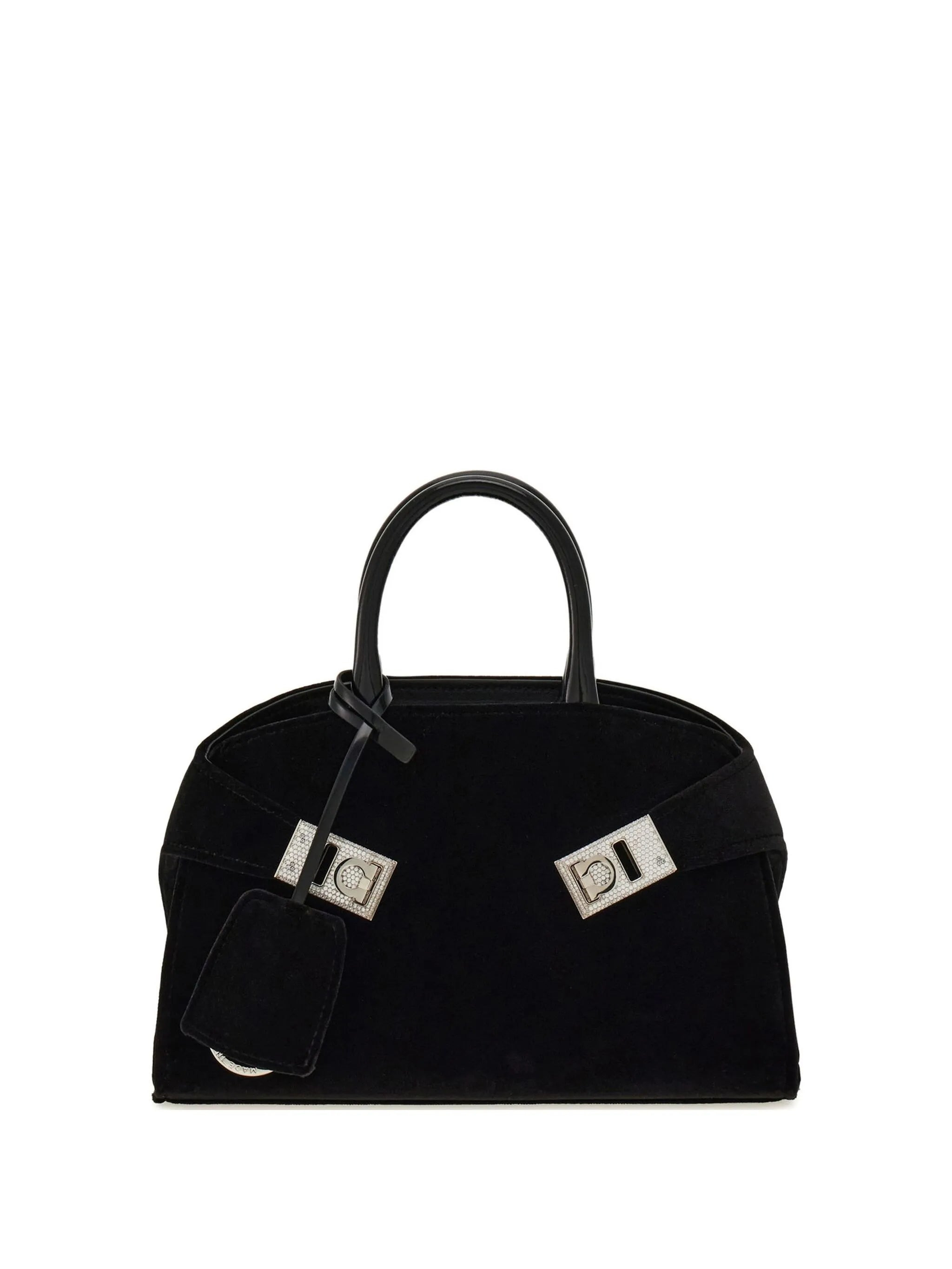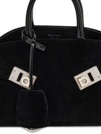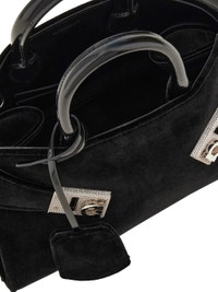 black two rolled top handles adjustable detachable shoulder strap Gancini buckle main compartment - depth: 11.0 centimetres, height: 14.0 centimetres, width: 22.5 centimetres - Color: BLACK - Made in: Italy - Designer Style ID: 219902 0786114 NERO Composition and care Outer Composition Calfskin: 5.0%, Outer Composition Fabric: 95.0%