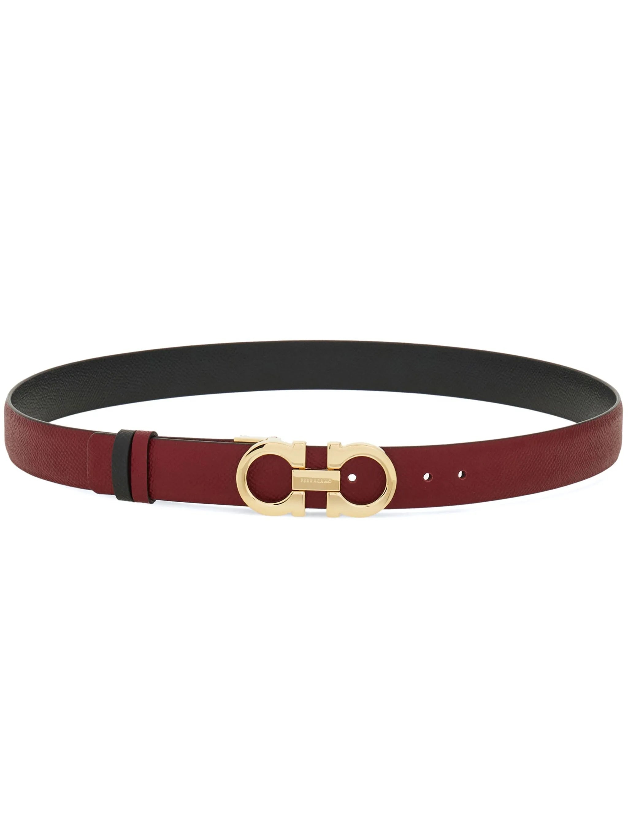 burgundy/black calf leather smooth grain reversible Gancini buckle buckle fastening punched holes flat tip adjustable fit - Color: RED/BLACK - Made in: Italy - Designer Style ID: 23A565 0780393- BO/NE Composition and care Outer Composition Calfskin: 100.0%