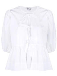 white organic cotton poplin texture bow detailing round neck front tie fastening short puff sleeves peplum hem - sleeve length: 36.8 centimetres, length: 54.6 centimetres, waist: 96.5 centimetres, bust: 99.1 centimetres - Color: WHITE - Made in: India - Designer Style ID: F7364 151 Composition and care Organic Cotton: 100.0%