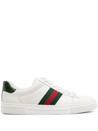 white leather signature Web-stripe trim contrasting branded heel counter decorative plaque round toe front lace-up fastening branded leather insole flat rubber sole This piece comes complete with a protective dust bag. Women's Gucci sneakers fit large. For the most comfortable fit please select half a size down. - heel: 2.5 centimetres, sole height: 2.0 centimetres - Color: WHITE - Made in: Italy - Designer Style ID: 757943 AACAG 9055 Composition and care Leather: 100.0%