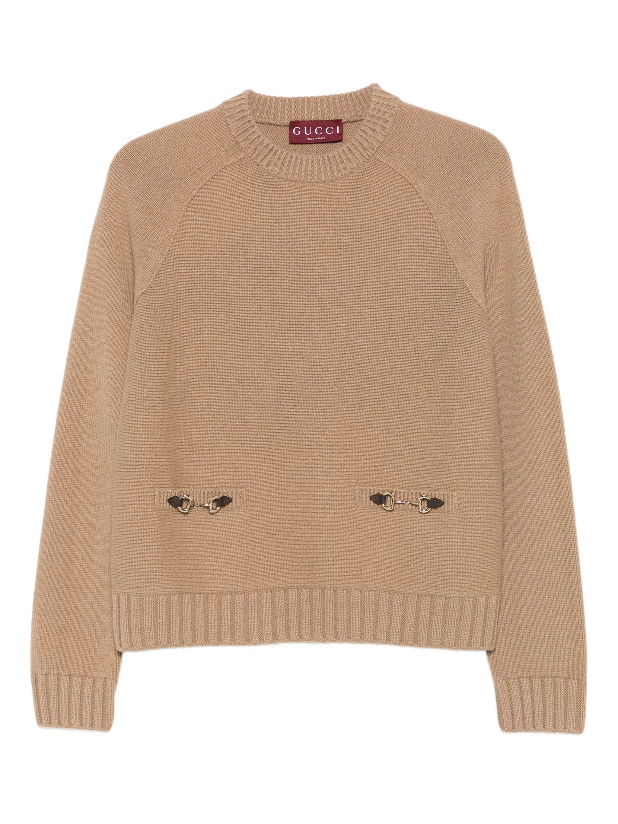 brown cable knit signature Horsebit detail long sleeves ribbed cuffs ribbed hem - Color: BROWN - Made in: Italy - Designer Style ID: 836460 XKEVK 2604 Composition and care Calf Leather: 100.0%, Cashmere: 30.0%, Wool: 70.0%, Brass: 100.0%