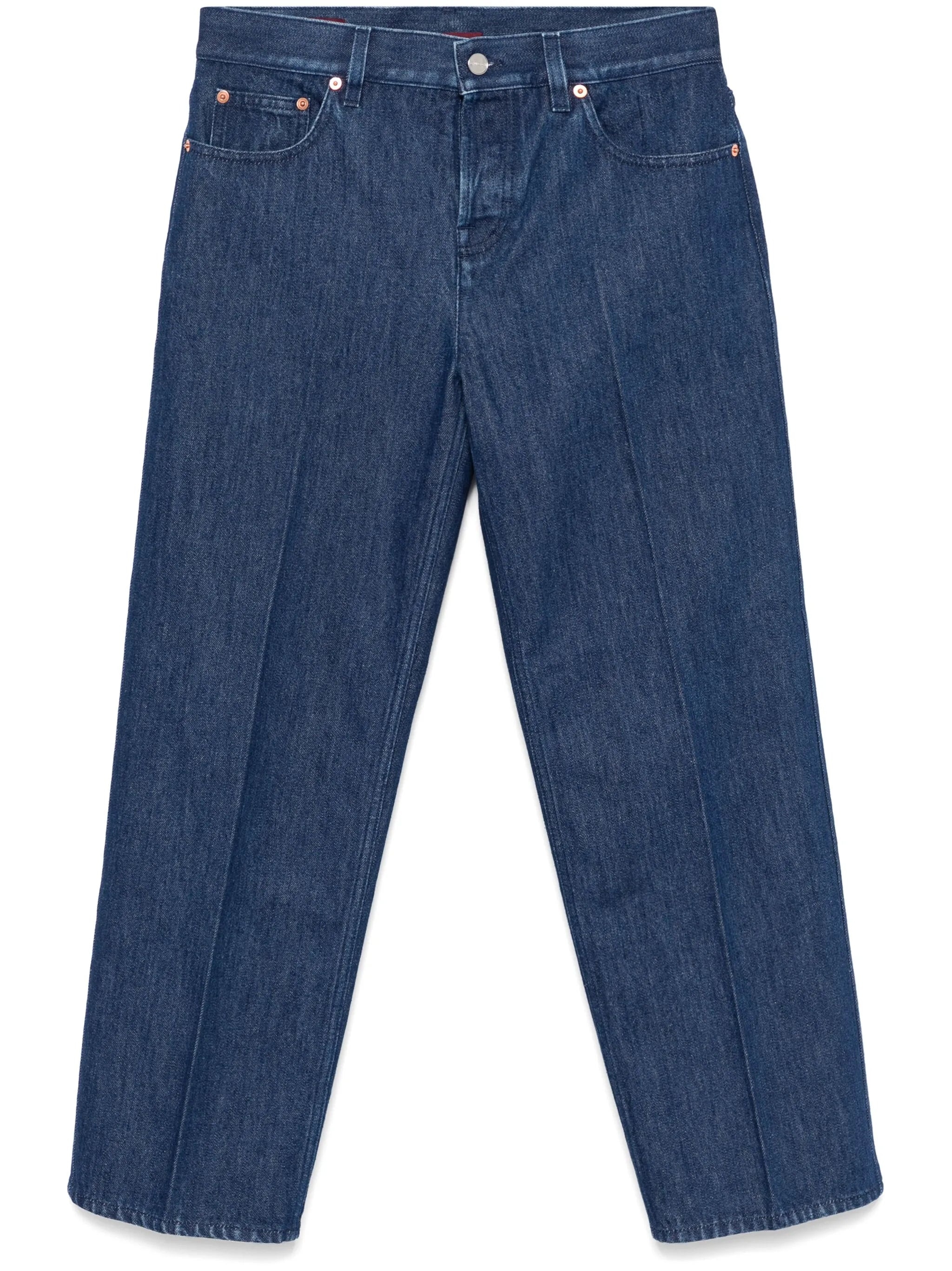 indigo blue button fly fastening classic five pockets belt loops logo patch to the rear - front rise: 28.0 centimetres, inside leg: 69.5 centimetres, hips: 100.0 centimetres, waist: 81.0 centimetres - Color: BLUE - Made in: Italy - Designer Style ID: 812233 XDC83 4100 Composition and care Outer Composition Cotton: 100.0%, Lining Composition Cotton: 35.0%, Outer Composition Calf Leather: 100.0%, Lining Composition Polyester: 65.0%