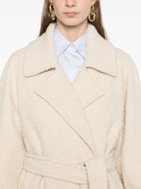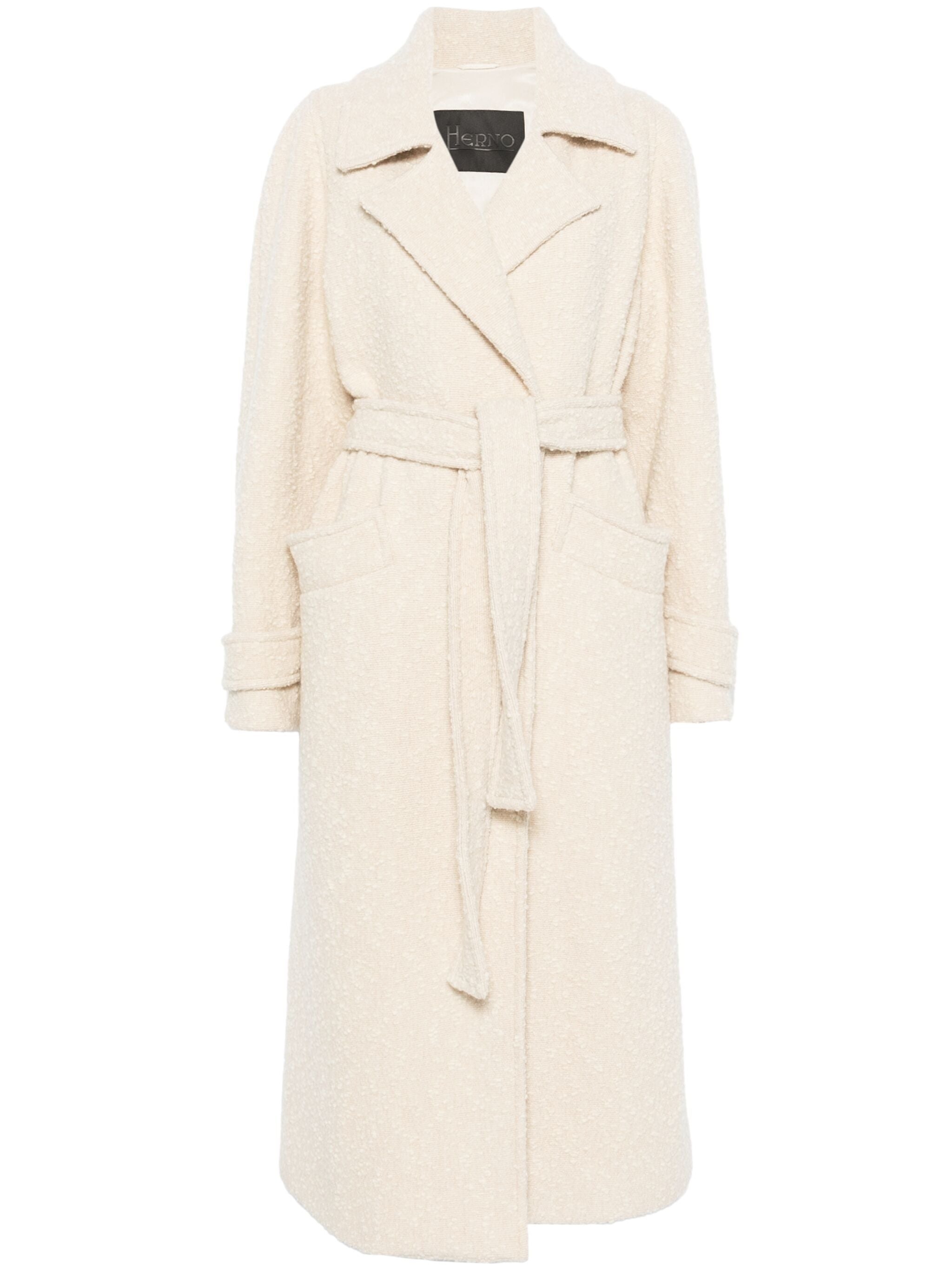 white wool blend boucle construction double-breasted button fastening detachable and adjustable waist belt wide notch lapels long sleeves belted cuffs two front welt pockets belt loops full lining straight hem long length - Color: NEUTRALS - Made in: Italy - Designer Style ID: 33433R CA000540D 1911 Composition and care Lining Composition Cotton: 49.0%, Outer Composition Polyamide: 20.0%, Lining Composition Viscose: 51.0%, Outer Composition Wool: 80.0%