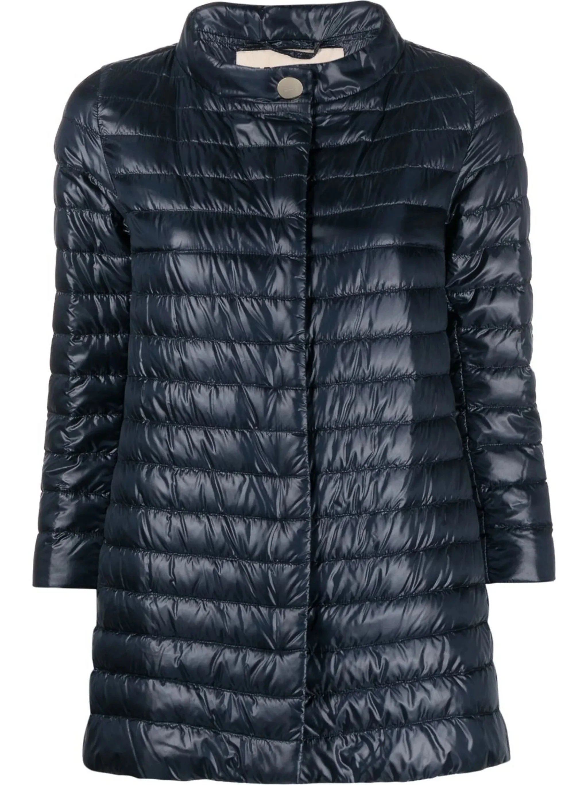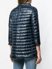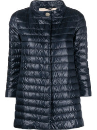 Founded in 1948, Herno offers a wide range of versatile, easy to wear reversible coats for city wear or weekend getaways. This blue feather down and cotton blend funnel neck padded jacket from Herno features a press stud fastening, cropped sleeves, horizontal panels, an a-line shape, a curved hemline and a long length. - sleeve length: 68.0 centimetres, shoulder width: 50.5 centimetres, length: 73.0 centimetres, waist: 95.0 centimetres, bust: 93.0 centimetres - Color: BLUE - Made in: Italy - Designer Style ID: 12017Z PI0767DIC 9200 Composition and care Outer Composition Cotton: 60.0%, Lining Composition Feather Down: 100.0%, Outer Composition Polyamide: 100.0%, Lining Composition Polyamide: 100.0%, Outer Composition Acetate: 40.0%