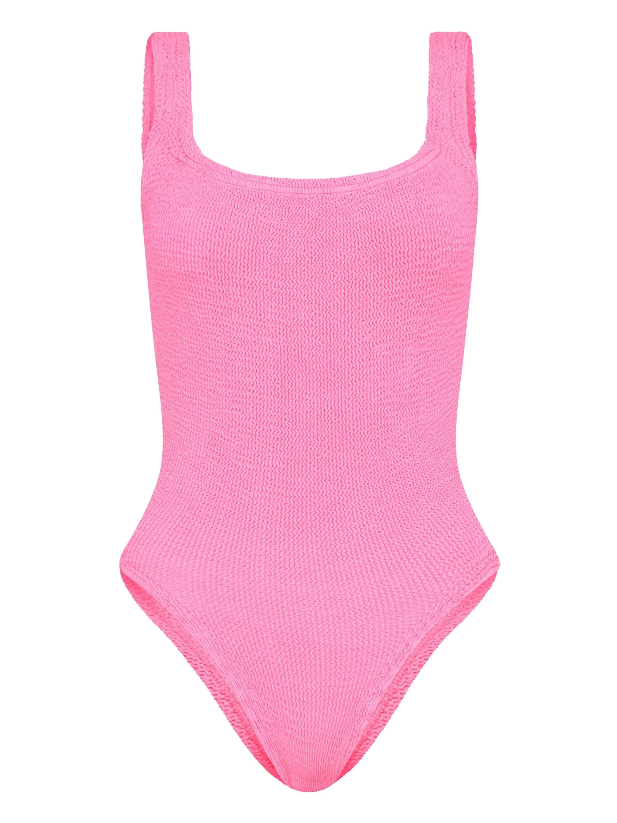 pink ruched detailing scoop neck open back stretch-design Be mindful to try on swimwear over your own garments. - bust: 34.0 centimetres, hips: 30.0 centimetres, length: 48.0 centimetres, shoulder width: 29.0 centimetres, waist: 30.0 centimetres - Color: PINK - Made in: United Kingdom - Designer Style ID: S-SQUARE-CR CRINKLE BUBBL Composition and care Polyamide: 97.0%, Elastane: 3.0%