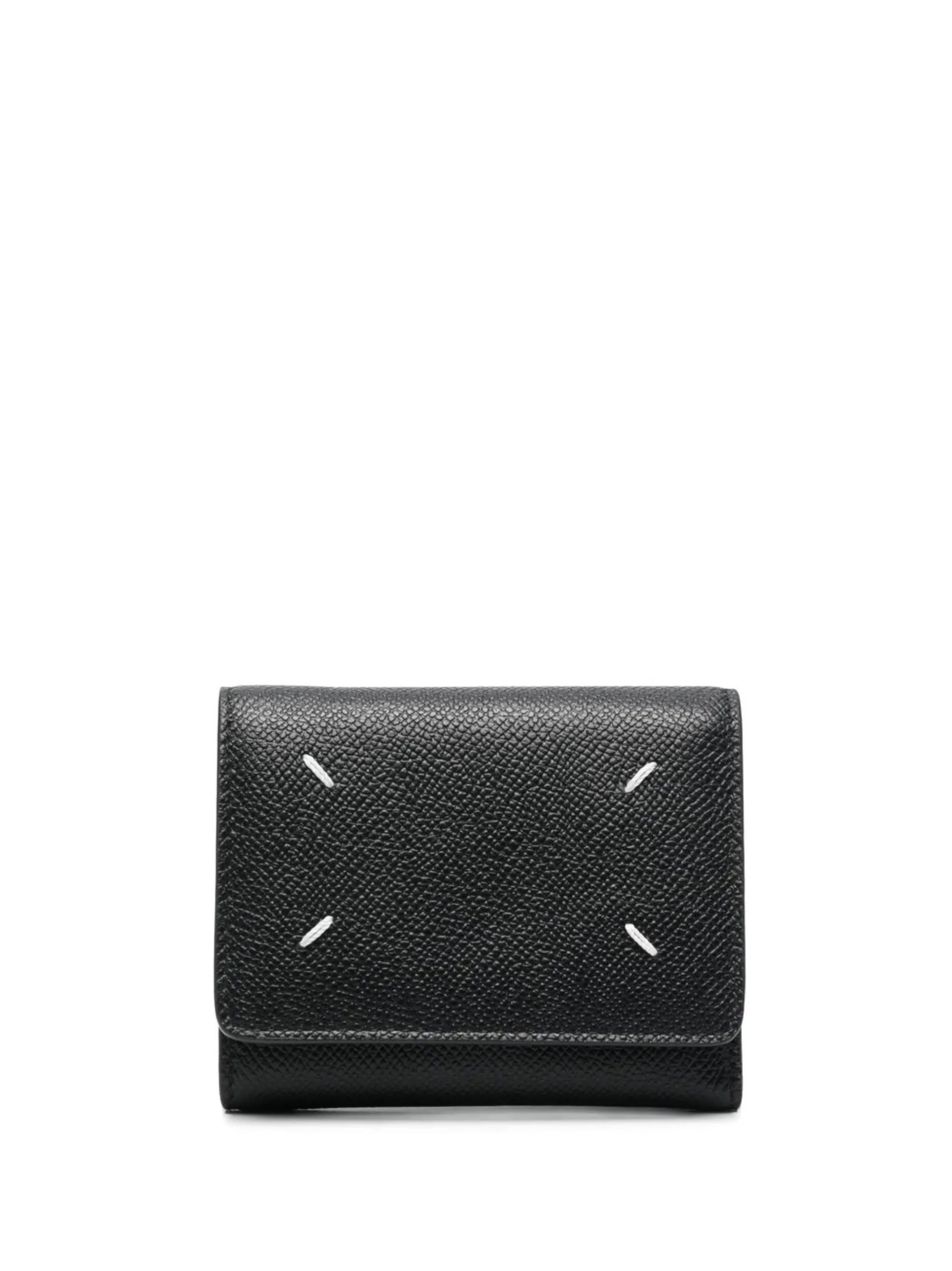 folded four-stitch wallet from Maison Margiela featuring black, calf leather, pebbled texture, signature four-stitch logo, folded design, internal card slots and coin pocket. - length: 11.0 centimetres, width: 8.0 centimetres - Color: BLACK - Made in: Italy - Designer Style ID: P4745 SA3UI0017 T8013 Composition and care Outer Composition Calf Leather: 100.0%, Lining Composition Calf Leather: 100.0%, Lining Composition Viscose: 100.0%