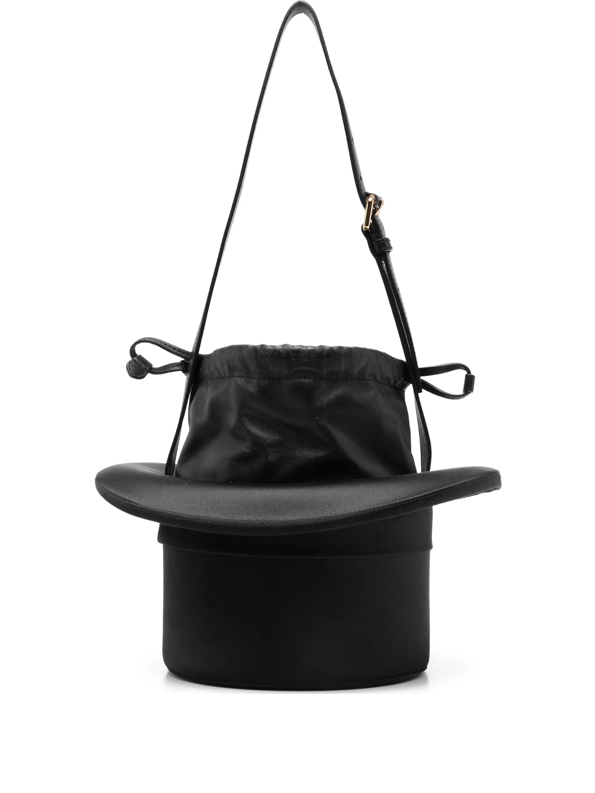 black hat shape drawstring closure adjustable shoulder strap - depth: 15.0 centimetres, height: 15.0 centimetres, width: 20.0 centimetres - Color: BLACK - Made in: Italy - Designer Style ID: MC4034PP1N OR2 00A Composition and care Outer Composition Calf Leather: 100.0%, Outer Composition Fabric: 100.0%