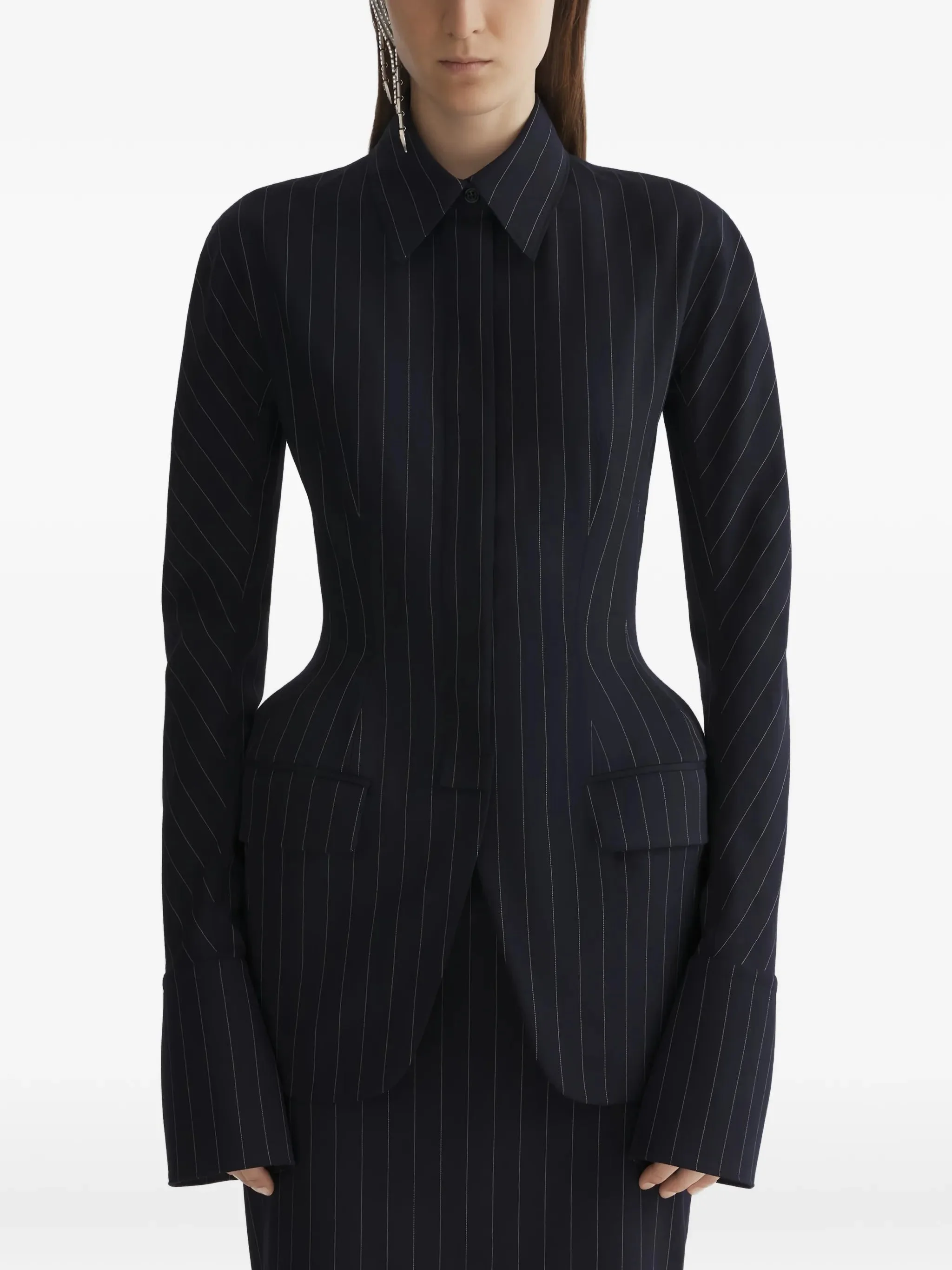 navy pinstripe hourglass shirt jacket