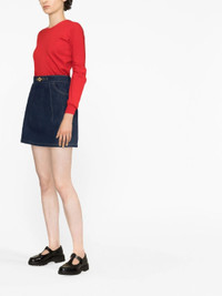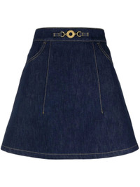 indigo blue cotton blend denim gold-tone hardware dart detailing contrast stitching embossed logo to the front rear zip fastening A-line - hips: 94.0 centimetres, length: 43.0 centimetres, waist: 72.0 centimetres - Color: BLUE - Made in: Tunisia - Designer Style ID: SK0420008 602D Composition and care Cotton: 92.0%, Polyester: 8.0%