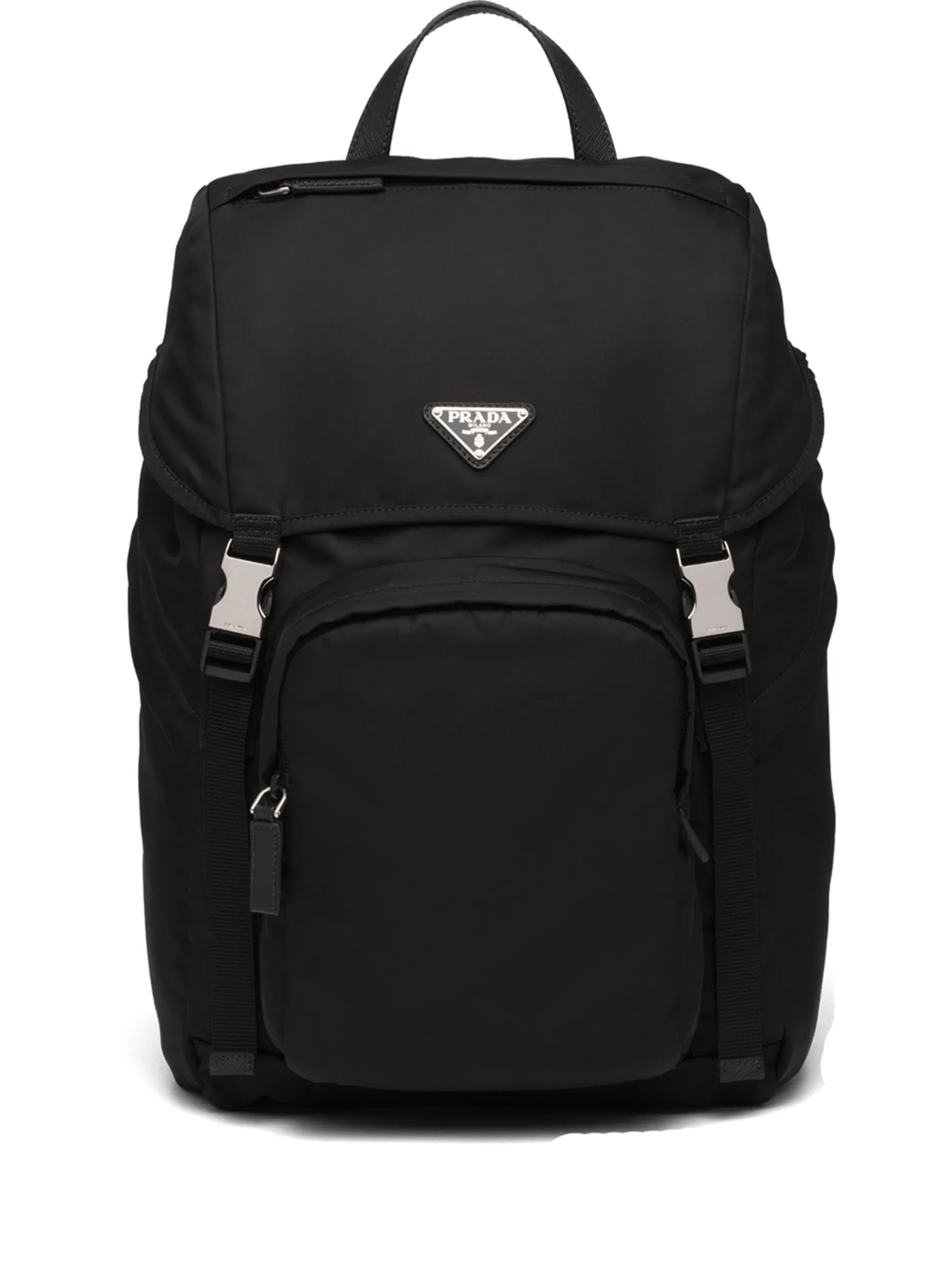 black leather enamel triangle logo single rounded top handle two adjustable shoulder straps front flap closure drawstring fastening multiple zip-fastening pockets mesh panelling main compartment internal zip pocket - depth: 14.0 centimetres, handle: 7.0 centimetres, height: 40.0 centimetres, strap: 47.0 centimetres, width: 29.0 centimetres - Color: BLACK - Made in: Italy - Designer Style ID: 2VZ135 V HOL 2DMG F0002 Composition and care Outer Composition Leather: 100.0%, Outer Composition Nylon: 100.0%